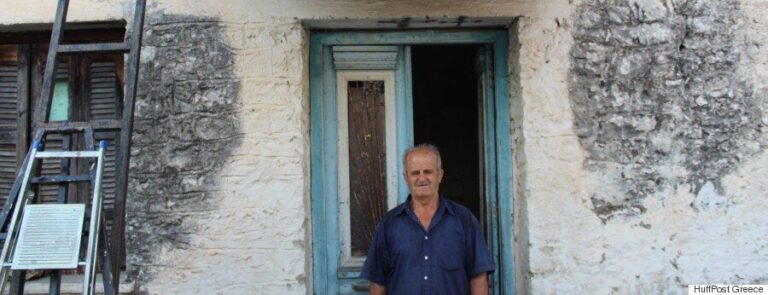 Ο Γρηγόρης Σκάρας, 5 χρονών την ημέρα της σφαγής, στέκεται σήμερα στην πόρτα του πατρικού σπιτιού του-το ένα από τα δύο μόνο σπίτια του χωριού που δεν κάηκαν.Ο ίδιος σώθηκε κρυμμένος σε ένα χαντάκι.