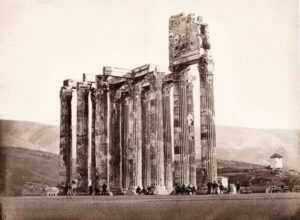 Δημήτριος Κωνσταντίνου: Θαμώνες του καφενείου στο ναό Ολυμπίου Διός. Διακρίνεται η σκήτη του στυλίτη μοναχού και στα δεξιά ο μύλος του Μετς σε πλήρη λειτουργία, 1865 (Συλλογή Pierre de Girord / Kallimages, Παρίσι)