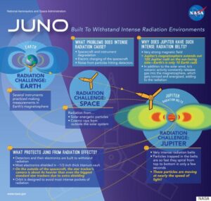 Κατά την αποστολή του, το διαστημόπλοιο θα πραγματοποιήσει 37 περιστροφές γύρω από τον γιγαντιαίο πλανήτη, πετώντας πάνω από τα ανώτερα επίπεδα των νεφών του- σε απόσταση περίπου 4.100 χιλιομέτρων. Κατά τη διάρκεια αυτών των πτήσεων, το διαστημόπλοιο θα «κοιτάξει» κάτω από τα νέφη, πραγματοποιώντας έρευνες με σκοπό την απόκτηση περισσότερων πληροφοριών για την προέλευση, τη δομή, την ατμόσφαιρα και τη μαγνητόσφαιρα του πλανήτη- η προέλευση της οποίας αποτελεί ένα από τα μεγαλύτερα αινίγματα του ηλιακού μας συστήματος.