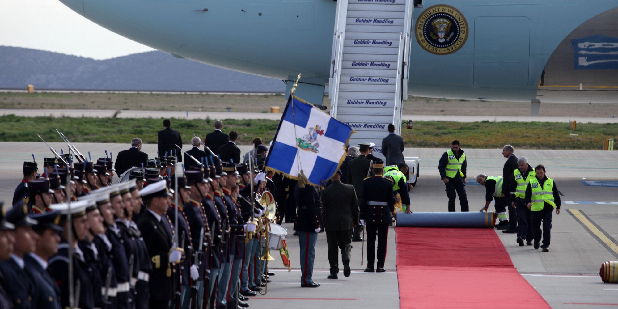 Έτσι, τελευταία στιγμή το στρατιωτικό άγημα μεταφέρθηκε πιο κοντά στο επιβλητικό αεροσκάφος και το προσωπικό του αεροδρομίου προσπάθησε κακήν κακώς να αναπληρώσει την απόσταση και να διορθώσει τη λάθος θέση στην οποία είχε τοποθετηθεί το κόκκινο χαλί.