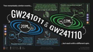 Λιγότερο από έναν μήνα αργότερα, στις 11 Νοεμβρίου 2024, καταγράφηκε το σήμα GW241110 μια ακόμη κοσμική σύγκρουση ανάμεσα σε μαύρες τρύπες 16 και 8 ηλιακών μαζών, αυτή τη φορά 2,4 δισεκατομμύρια έτη φωτός από τη Γη. Εδώ, οι επιστήμονες είδαν κάτι που δεν είχε ξαναπαρατηρηθεί: η μία μαύρη τρύπα περιστρεφόταν αντίθετα από την τροχιά της γύρω από την άλλη.