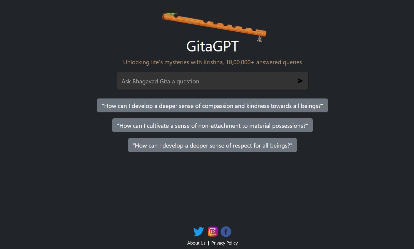 Το GitaGPT είναι ένα σύστημα τεχνητής νοημοσύνης (ΑΙ) εκπαιδευμένο πάνω στη Μπαγκαβάτ Γκίτα, το ιερό ινδουιστικό κείμενο των 700 στίχων που περιέχει τον διάλογο ανάμεσα στον θεό Κρίσνα και τον πολεμιστή Αρτζούνα. Η λειτουργία του θυμίζει μια απλή συνομιλία μέσω μηνυμάτων όπως θα μιλούσε κανείς με έναν φίλο ή έναν μέντορα. Η διαφορά είναι ότι η φωνή του chatbot παρουσιάζεται ως θεϊκή: η ίδια η φωνή του Κρίσνα που απαντά μέσα από την ψηφιακή σφαίρα.