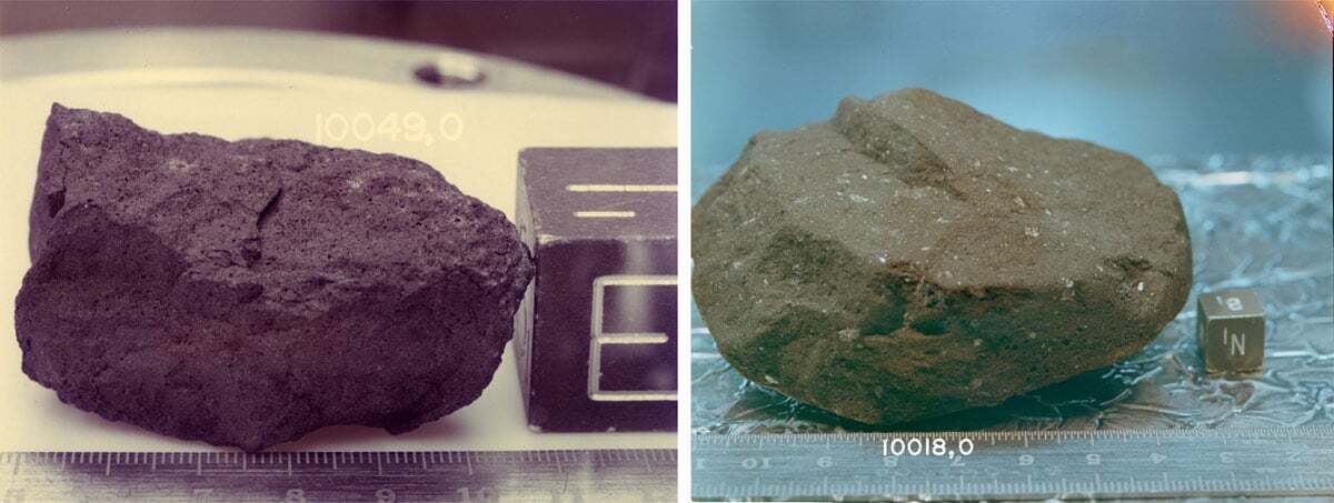 Βασάλτης 10049 της αποστολής Apollo 11 (αριστερά) και βρέτσια 10018 (δεξιά). Πηγή: NASA/LPI