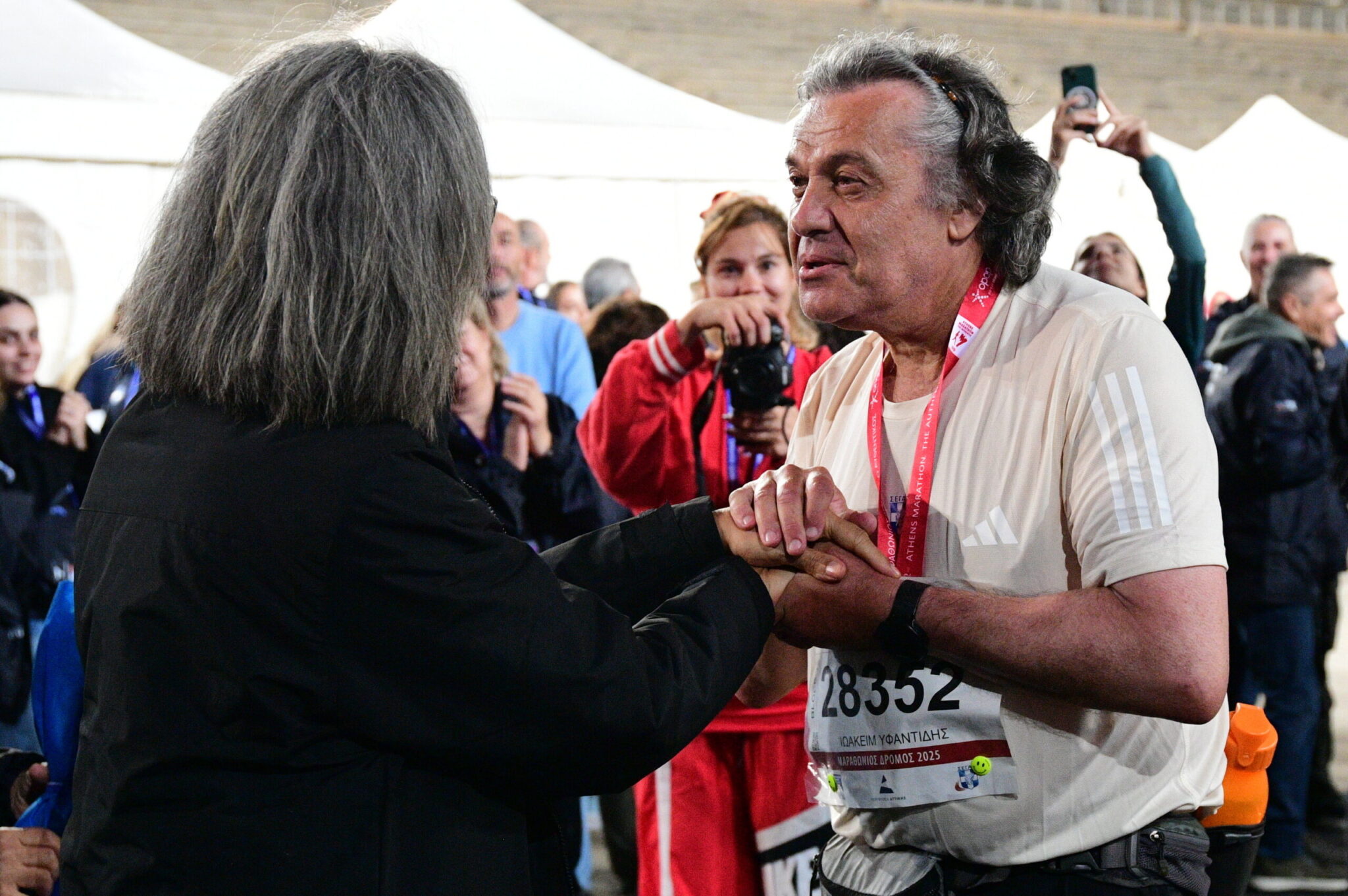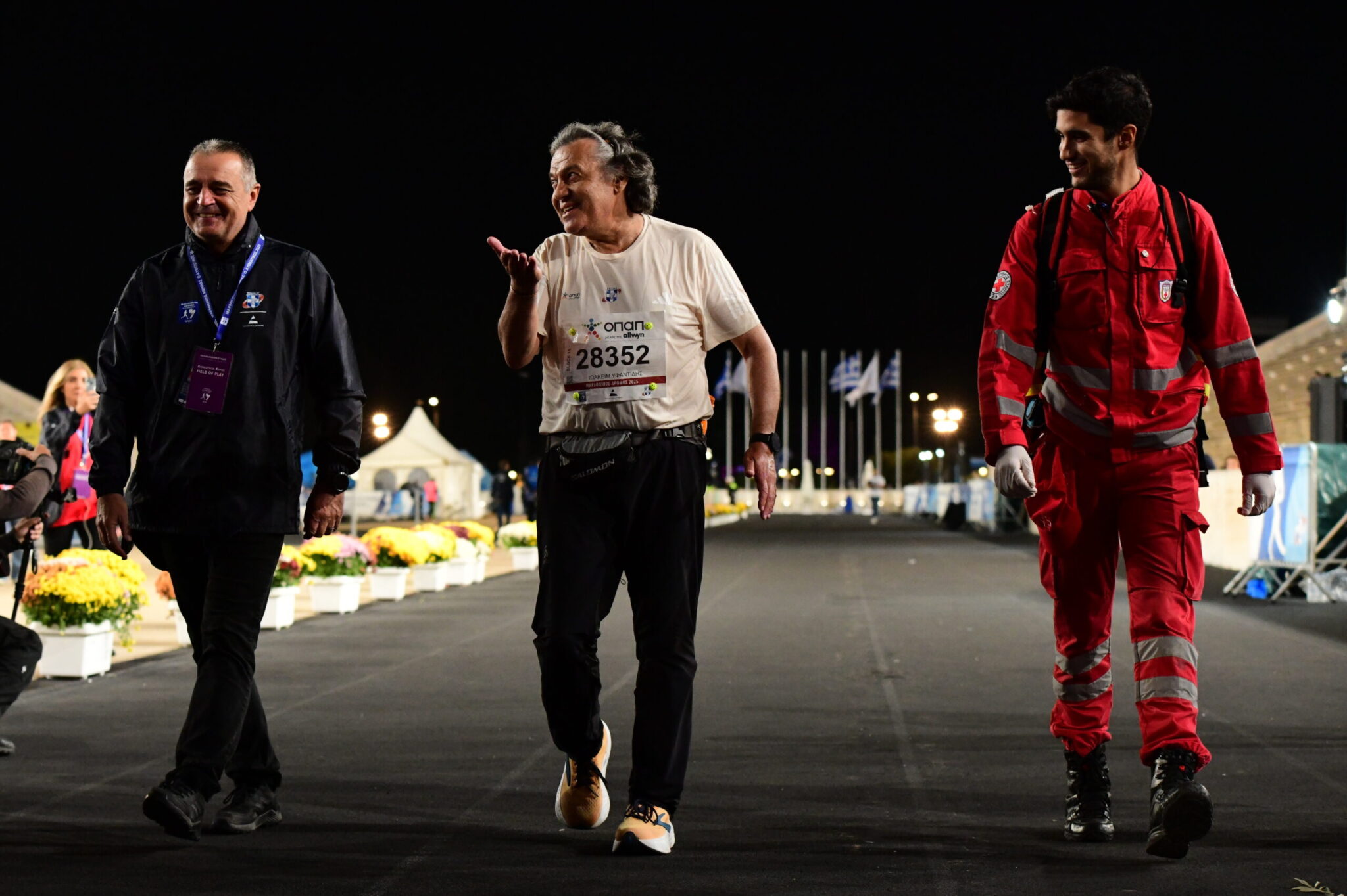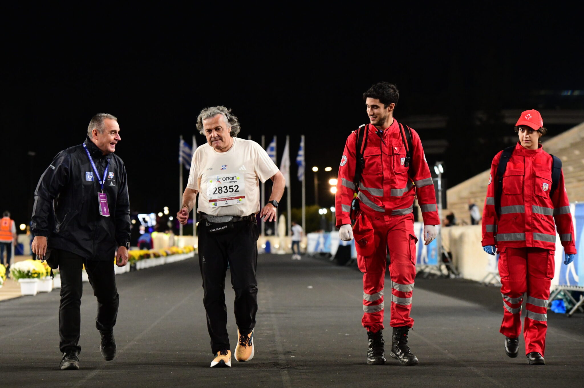 Εκεί τον υποδέχθηκε η πρόεδρος του ΣΕΓΑΣ, Σοφία Σακοράφα, που τον χειροκρότησε θερμά, του απένειμε το μετάλλιο του τερματισμού και το ειδικό έπαθλο που, σύμφωνα με την παράδοση, απονέμεται κάθε χρόνο στον τελευταίο δρομέα που ολοκληρώνει τη διαδρομή.