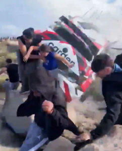 Συγκεκριμένα, στο βίντεο φαίνεται ο οδηγός του αμαξιού, ενώ έχει αναπτύξει μεγάλη ταχύτητα σε διαδρομή σε χωματόδρομο να χάνει τον έλεγχο του οχήματος, να βγαίνει από την πορεία του και να πέφτει πάνω στους θεατές λίγο πριν βρεθεί τουμπαρισμένο σε ένα χαντάκι μερικές εκατοντάδες μέτρα παραπέρα, ενώ επικρατεί κατάσταση πρωτοφανούς πανικού.