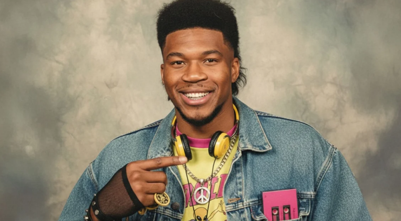 Στην πρώτη φωτογραφία ο Αντετοκούνμπο εμφανίζεται ως ροκάς με… χαίτη, στη δεύτερη έχει μια πιο ’80s νότα στο λουκ του, στην τρίτη θυμίζει μαθητή σχολείου με το παπιγιόν του, στην τέταρτη μεταμορφώθηκε ως σκεϊτάς ενώ η τελευταία θα μπορούσε να είναι από το άλμπουμ κολλεγίου στο οποίο θα είχε φοιτήσει.