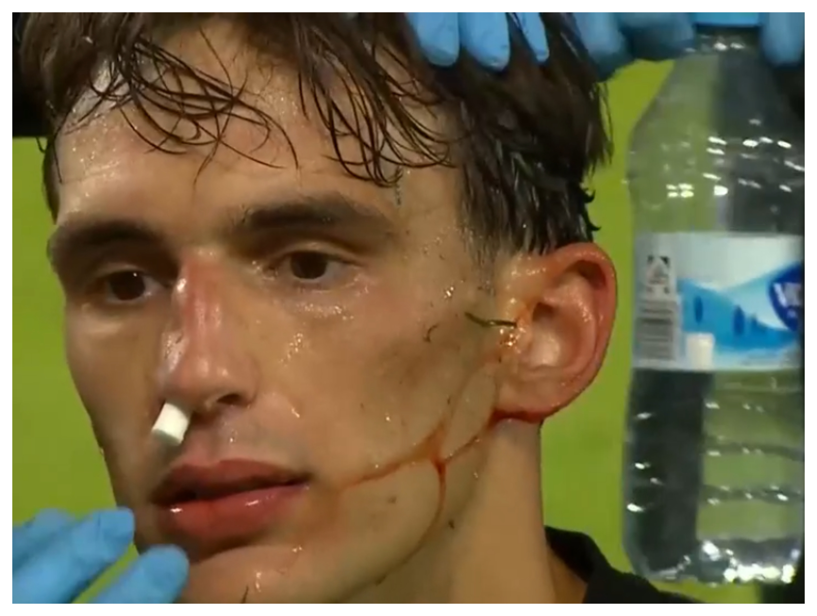 Ο 21χρονος γκολκίπερ έπεσε στο χορτάρι και όπως διαπιστώθηκε μερικά δευτερόλεπτα αργότερα τραυματίστηκε στη μύτη και το πρόσωπο, με αποτέλεσμα χρειαστεί να μπουν στο γήπεδο οι γιατροί της Εθνικής και να του παρέχουν τις πρώτες βοήθειες.