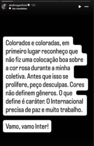 Ο Άμπελ Μπράγκα παρουσιάστηκε την Κυριακή ως προπονητής της Ιντερνασιονάλ, η οποία αντιμετωπίζει τον υποβιβασμό ενώ απομένουν δύο αγωνιστικές. Ωστόσο, η πρώτη του συνέντευξη Τύπου στην πόλη Πόρτο Αλέγκρε προκάλεσε έντονες αντιδράσεις όταν αναφέρθηκε στις φανέλες της προπόνησης.