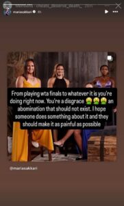 Η Μαρία Σάκκαρη ξέσπασε μέσω Instagram για τα μηνύματα που δέχεται από αγνώστους στα μέσα κοινωνικής δικτύωσης, σε μια χρονιά που δεν κατάφερε να πετύχει τους προσωπικούς της στόχους στο τένις και να φτάσει μακριά στις διοργανώσεις που συμμετείχε.