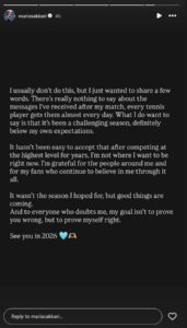 «Συνήθως δεν το κάνω αυτό, αλλά θα ήθελα να μοιραστώ μερικές λέξεις. Δεν υπάρχει αλήθεια κάτι να πω για τα μηνύματα που έλαβα μετά το παιχνίδι μου, κάθε τενίστας λαμβάνει τέτοια σχεδόν καθημερινά. Αυτό που θέλω να πω είναι ότι είχα μια ανταγωνιστική σεζόν, σίγουρα κατώτερη των προσδοκιών μου.