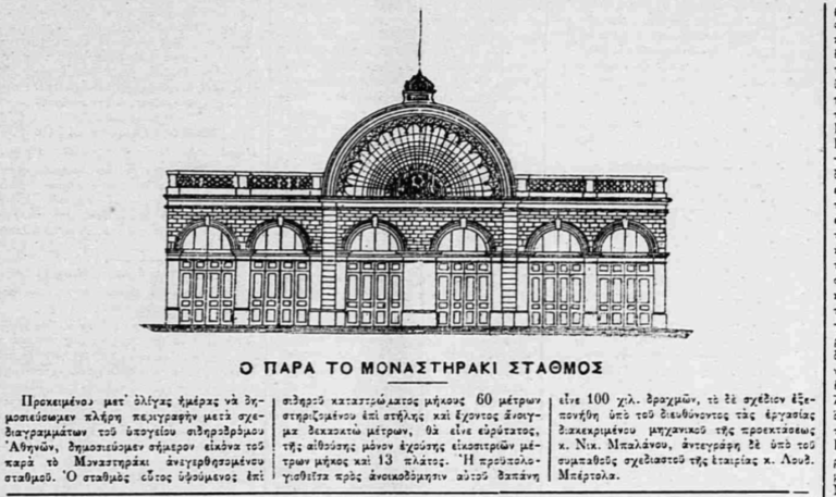 Κάτω από το σιδερένιο αυτό στέγαστρο θα υπάρχουν διπλές αποβάθρες και διαφορετικές σκάλες εισόδου και εξόδου στις αμαξοστοιχίες και άλλες που θα οδηγούν στην κεντρική αίθουσα η οποία θα έχει πλάτος 25 μ. επί 13 μ. Η αξία της οικοδομής αυτής μαζί με τα έξοδα της ανέγερσης του σταθμού της Ομόνοιας, υπολογίστηκαν σε 300.000 δρχ».