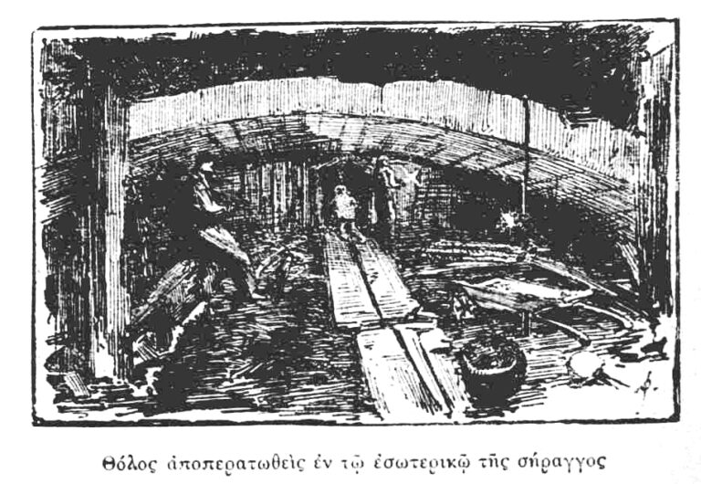 «Από το μέρος των διαπλατύνσεων το θέαμα άλλαξε. Βλέπαμε ωχρά τα φώτα των λυχνών των εργατών και τους ίδιους ως σκιές κινούμενες ενώ πάνω στα σανίδια που είχαν τοποθετηθεί στο γλοιώδες έδαφος εσύροντο με ταχύτητα μικρές μονότροχες χειράμαξες γεμάτες από τα υλικά που έπεφταν από τα διάφορα φρεάτια. Οι θόλοι έσταζαν νερά, δεν υπήρχε έργο αποστράγγισης ακόμα και ευτυχώς μας είχε εφοδιάσει ο κ. Μπαλάνος με αδιάβροχα. Σε μία μάλιστα οπή εκείνου του σημείου στην αρχή των εργασιών, όπως μας ενημέρωσε ο κ. Μπαλάνος, σημειώθηκε περίεργο φαινόμενο συρροής μεγάλου αριθμού κουνουπιών τα οποία καταταλαιπώρησαν με τα τσιμπήματά τους, τους άμοιρους εργάτες.