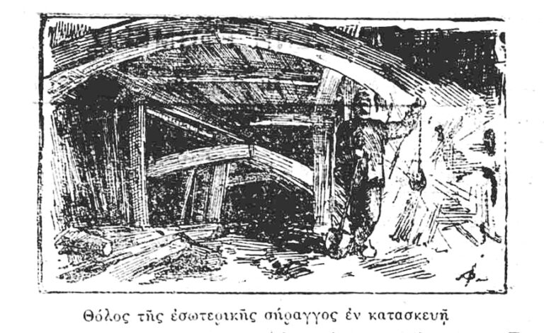 Οι θόλοι των υπογείων εργασιών κατασκευάστηκαν από χαλίκι, άμμο και τσιμέντο που αποτέλεσε συμπαγές μίγμα πολύ ισχυρότερο και αυτών των λίθων. (Ενδιαφέρουσα η αναφορά των υλικών ξεχωριστά, που σήμερα είναι γνωστό ως «σκυρόδεμα» ενώ τότε ήταν άγνωστη ακόμα η ονομασία και η ευρεία χρήση του δομικού αυτού υλικού). Οι δε θόλοι των ανοιχτών εργασιών ενισχύθηκαν με την συναρμολόγηση λίθων και θηραϊκής γης λόγω της χαλαρότητας του εδάφους. Η σήραγγα είχε συνολικό μήκος 665 μέτρων, μη συμπεριλαμβανομένων των 60 μέτρων του μεταλλικού καταστρώματος, πλάτος 8 μέτρων καθ΄ όλον το διάστημα και 10 μ. στις εξόδους, βάθος δε 5μ και 20% . Ο μεν θόλος της θα βρίσκεται σε βάθος 3 και 5 μ. από την επιφάνεια του εδάφους, οι δε γραμμές σε βάθος 11 και 12 μ.». (Για να κατανοήσουμε την περιγραφή του δημοσιεύματος θα πρέπει να αναφέρουμε ότι 20% πρέπει να είναι η κλίση της σήραγγας. Η κλίση του πυθμένα. Η σήραγγα είναι σε κλίση για να στραγγίζει τα υπόγεια νερά που περνάνε μέσα από το θόλο της σήραγγας. Επίσης το βάθος δεν είναι σταθερό γιατί δεν είναι σταθερή η στάθμη της επιφάνειας του εδάφους. Επομένως η σήραγγα έχει ύψος μεταξύ 7μ – 8μ (11-3=8 — 12-5=7).