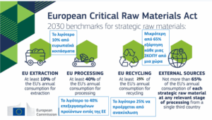 Για να κατανοήσουμε και να εκτιμήσουμε την προοπτική αλλλά και τη δυναμική συγκεκριμένων σχετικών έργων, είναι σημαντικό να γνωρίζουμε τη συνολική στρατηγική της ΕΕ. Η Κανονιστική Πράξη για τις Κρίσιμες Πρώτες Ύλες(CRMA) θέτει σαφή σημεία αναφοράς για το 2030, με στόχο την μείωση εξάρτησης προμήθειας των Κρίσιμων Ορυκτών Πρώτων Υλών (ΚΟΠΥ) από εισαγωγές (Σχ.1):