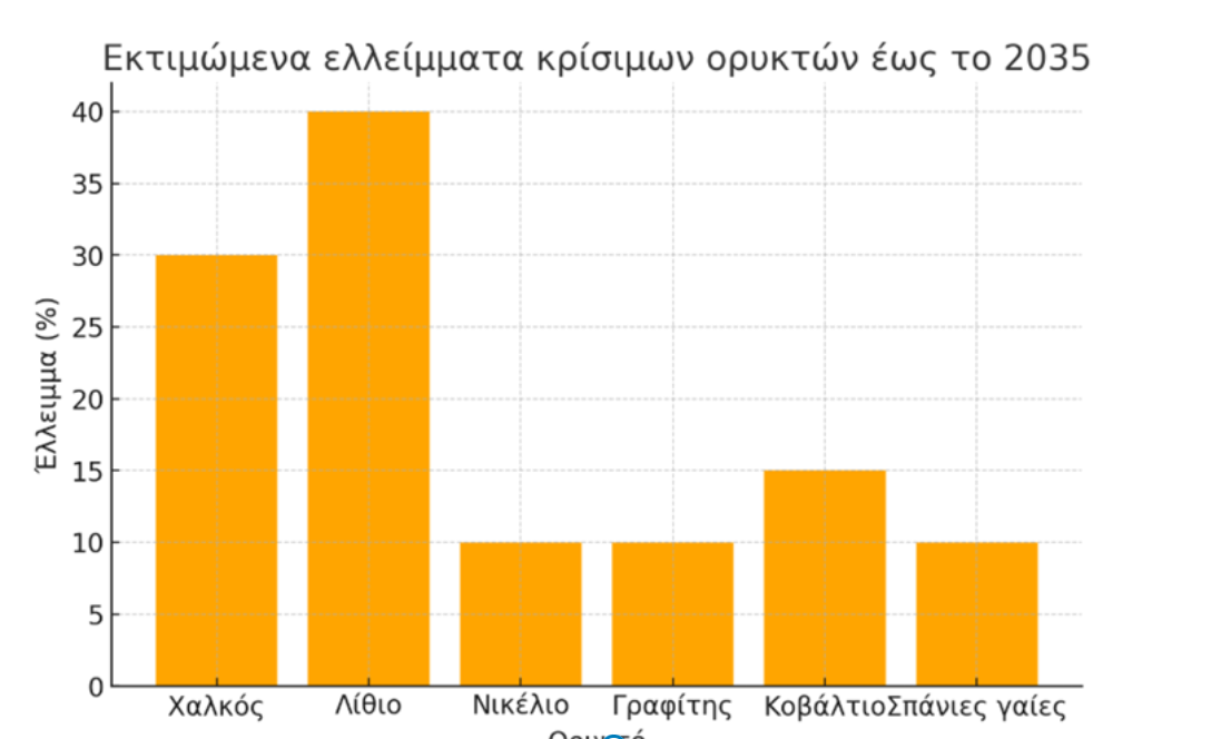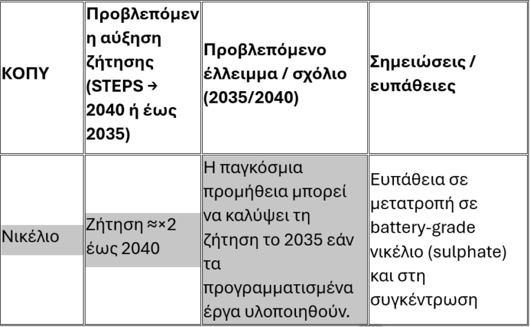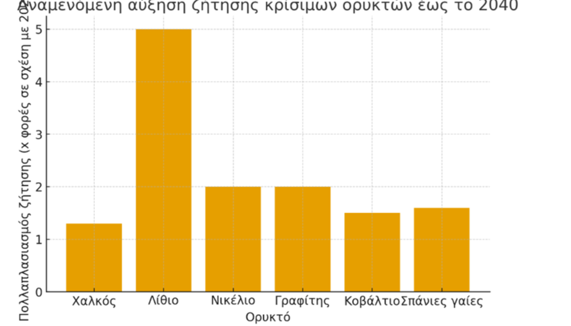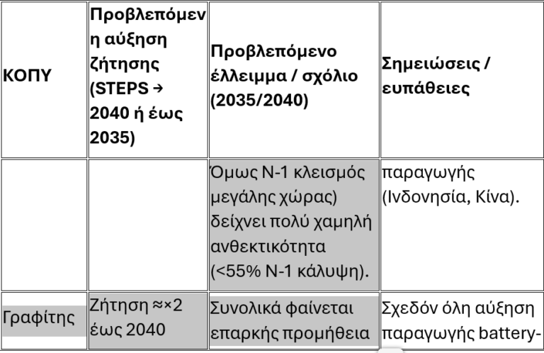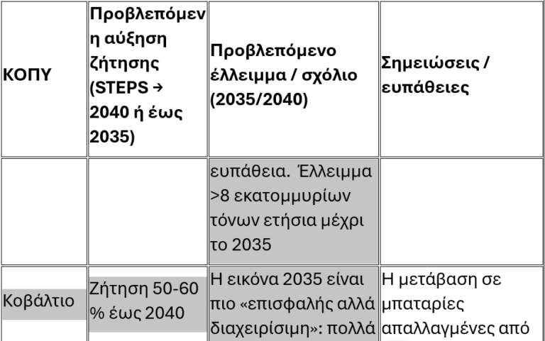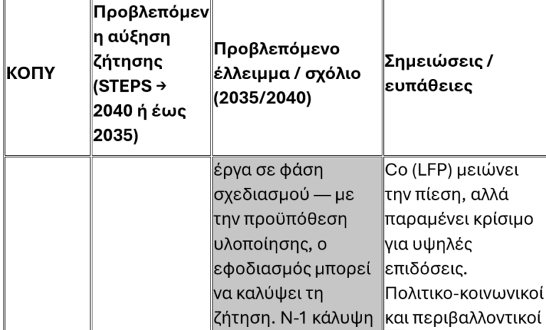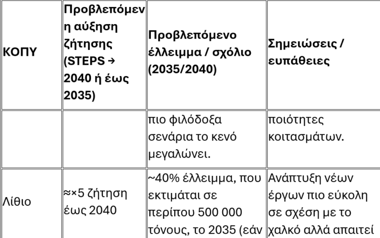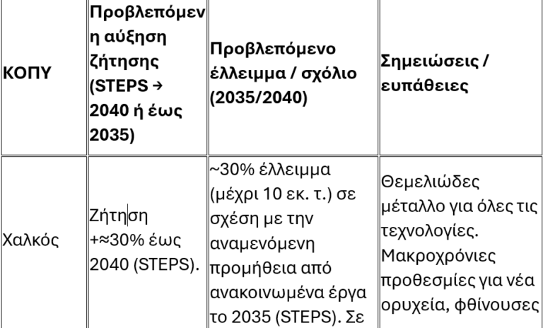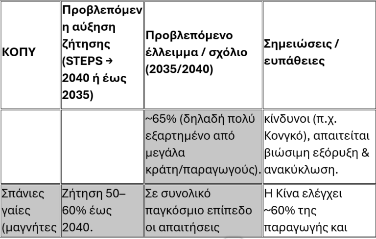 Εδώ παρουσιάζονται κάποια στοιχεία σχετικά με την ζήτηση και τα όποια ελλειματα προβλέπονται συμφωνα με τις ανάγκες του 2035 ή το 2040 για το χαλκό, το λιθιο, το νικέλιο, τον γραφίτη, το κοβάλτιο και τις σπανιες γαίες.