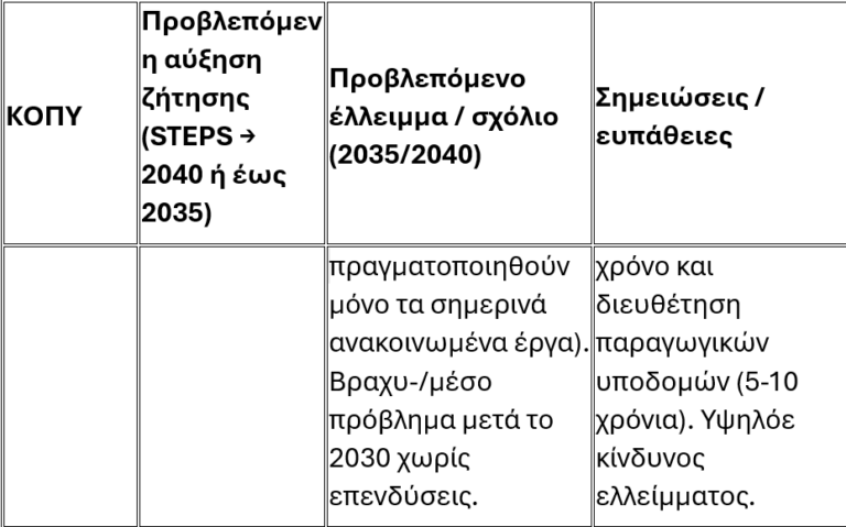 Σενάρια IEA: Τα νούμερα παραπάνω βασίζονται κατά κύριο λόγο στο StatedPoliciesScenario (STEPS) της IEA (προβλέψεις βάσει σημερινών πολιτικών/ανακοινώσεων). Σε πιο φιλόδοξα σενάρια η ζήτηση και τα ελλείμματα γίνονται συχνά μεγαλύτερα.