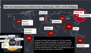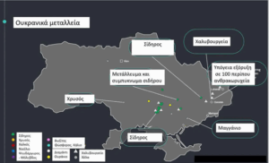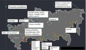 Ουκρανία και Ρωσία λοιπόν, δύο ιστορικά αμιγώς μεταλλευτικές χώρες, που το 2021 συμμετείχαν με 13 και 69 δις δολλάρια, αντίστοιχα, στην συνολικά παραγόμενη μεταλλευτική αξία, ύψους 1030 δις δολλάριων, στον κόσμο, μεταλλικά και βιομηχανικά ορυκτά μαζί (Σχήμα 1). Η Ρωσία παράγει το 8% νικελίου, 23% βαναδίου, 41% παλλαδίου, 5% κοβαλτίου, 4% χαλκού και 6% αλουμινίου στον κόσμο. Και στις δύο χώρες η βιομηχανία ορυκτών πρώτων υλών συνεισφέρει σημαντικά στην εθνική τους οικονομία, συμμετέχοντας με 2,2% στο ΑΕΠ της Ρωσίας και 2,9% στο ΑΕΠ της Ουκρανίας. Αποτελεί επίσης το 10,8% και το 9,5% των εξαγωγών των δύο χωρών αντίστοιχα.
