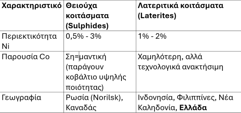 Η γεωλογία του νικελίου και του κοβαλτίου καθορίζει σε μεγάλο βαθμό την τεχνολογία επεξεργασίας και το περιβαλλοντικό αποτύπωμα. Στον πίνακα οι δύο κυρίαρχοι τύποι.