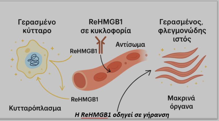 Μία μικρή πρωτεΐνη ονόματι ReHMGB1, που κάποτε θεωρούνταν απλώς ένα σήμα ενεργοποίησης της φλεγμονής ή συγκεκριμένης γονιδιακής έκφρασης, ανάλογα που βρισκόταν – στον πυρήνα ή στο κυτταρόπλασμα – αποκαλύφθηκε ως ένας τροβαδούρος του κυτταρικού γήρατος. Όταν τα κύτταρα γεράσουν και γίνουν ιδιότροπα, δεν κάθονται απλώς άπραγα. Απελευθερώνουν ReHMGB1 στο αίμα, όπου ταξιδεύει σαν αγγελιαφόρος της παρακμής, ψιθυρίζοντας σε μακρινά όργανα: «Ήρθε η ώρα, φίλοι μου. Ώρα να επιβραδύνετε».