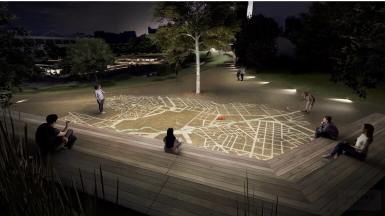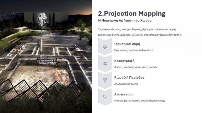Η παρέμβαση που υλοποιείται από το Εθνικό Κέντρο Έρευνας Φυσικών Επιστημών «Δημόκριτος», αφορά στην εγκατάσταση στο νότιο τμήμα του αρχαιολογικού χώρου ενός περιπτέρου, το οποίο θα στεγάζει τέσσερις διαδραστικές οθόνες αφής, με πρόσβαση σε πολυμεσικές πληροφορίες (κείμενα, εικόνες, βίντεο, αναπαραστάσεις κ.α.). Η σύνθεση περιλαμβάνει τέσσερις ορθογώνιες μονάδες, καλυμμένες από κυματοειδές στέγαστρο. Η πρόσβαση στο περίπτερο γίνεται από τα άκρα, με ράμπες. Το έργο είναι αποτέλεσμα της συνεργασίας του ΕΚΕΦΕ «Δημόκριτος» με το αρχιτεκτονικό γραφείο Foster+Partners, το World Human Forum και του Υπουργείου Πολιτισμού. Την επιλογή του πληροφοριακού επιμελούνται διεθνούς κύρους ακαδημαϊκοί, επιστήμονες και καλλιτέχνες. Η ψηφιακή εγκατάσταση επιτρέπει την εύκολη ανανέωση και τον εμπλουτισμό του ενημερωτικού υλικού, ανάλογα με την πρόοδο της έρευνας.