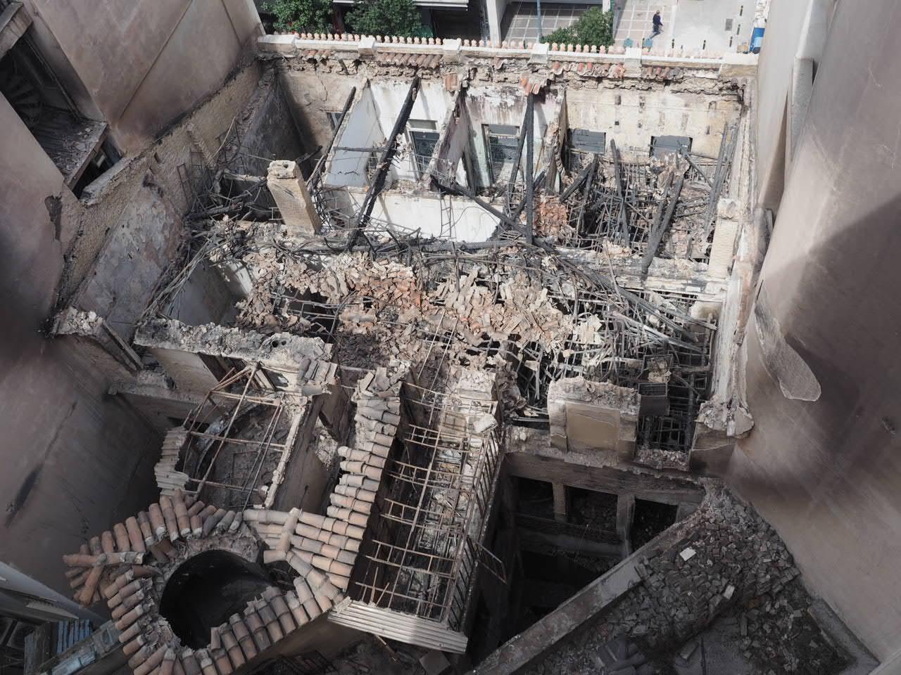 Την 1η Μαΐου 2020, στο κτήριο εκδηλώθηκε πυρκαγιά που φέρεται να ξεκίνησε από τον 2ο όροφο του κτηρίου, επί της οδού Σταδίου, όπου και περιορίστηκε, με αποτέλεσμα να καταστραφεί μέρος του ξύλινου πατώματος του 2ου ορόφου, να καταρρεύσει η δίρριχτη ξύλινη στέγη και να γίνουν περαιτέρω εκτεταμένες ζημιές στους υποκείμενους ορόφους. Μετά την πυρκαγιά, έγιναν άμεσες ενέργειες από την αρμόδια Διεύθυνση Προστασίας και Αναστήλωσης Νεώτερων και Σύγχρονων Μνημείων του Υπουργείου Πολιτισμού (υποστύλωση, καθαρισμός από πυρόπληκτα υλικά, στήριξη και προστασία των εσωτερικών δομικών στοιχείων καθώς και σωζόμενων τοιχογραφιών και οροφογραφιών, ικριώματα αντιστήριξης εξωτερικής τοιχοποιίας με πρόβλεψη να μπορεί να φέρει προσωρινή στέγη προστασίας).
