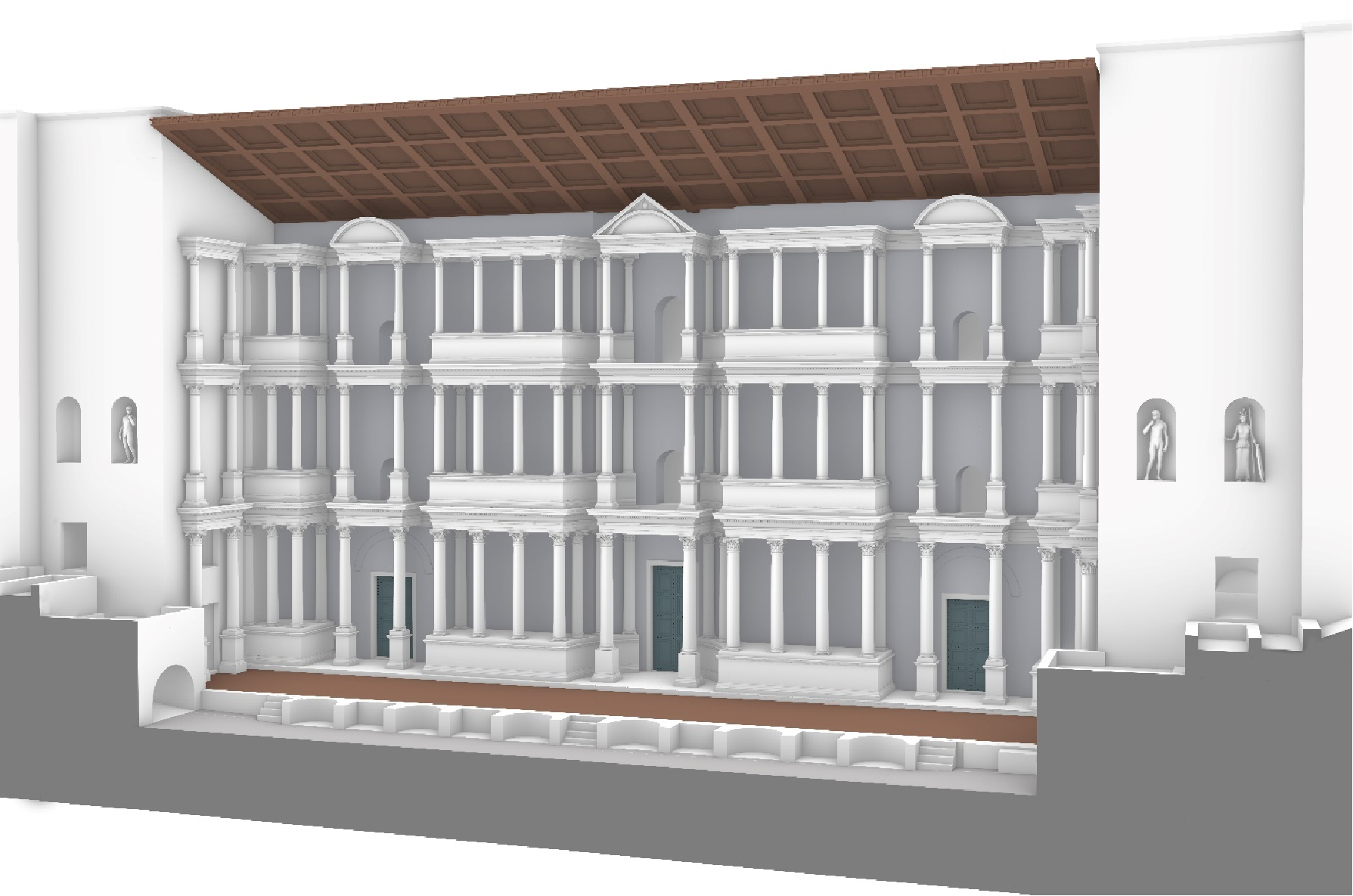 Το σκηνικό οικοδόμημα του Θεάτρου αποτελείται από το κυρίως κτήριο της σκηνής, στην όψη του οποίου διαμορφώνεται μνημειώδης τοίχος με κιονοστοιχίες (scaenae frons) επί τεσσάρων βάθρων, το προσκήνιο με τον μπροστινό του τοίχο (fonts pulpiti) και τα παρασκήνια εκατέρωθεν του προσκηνίου. Εξωτερικά του σκηνικού οικοδομήματος διαμορφώνονταν στοά σχήματος Π, η οποία οδηγούσε στις δύο εισόδους των παρόδων. Εσωτερικά, στη στάθμη του ισογείου, το σκηνικό οικοδόμημα χωρίζεται σε επτά συμμετρικά διατεταγμένους θολωτούς χώρους, τρεις από τους οποίους αποτελούν διόδους -κεντρική είσοδος και δύο εκατέρωθεν αυτής, ανατολικά και δυτικά.