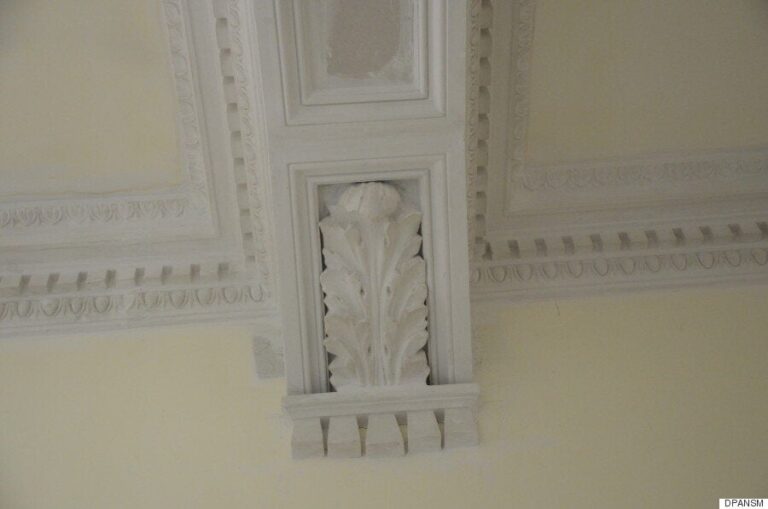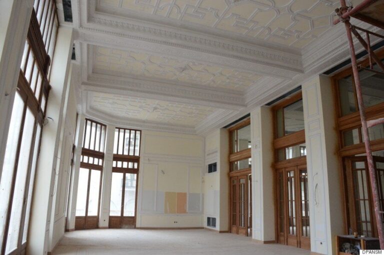 Από τις ξύλινες τζαμαρίες φαίνεται η Πατησίων, το Μουσείο και το ιστορικό κτίριο του ΕΜΠ- ο διάκοσμος στα παλιά, αυθεντικά κουφώματα είναι σκαλισμένος με το χέρι και μπορεί να γίνει αντιληπτός από όποιον περαστικό στρέψει το βλέμμα του. Στο ισόγειο περπατάμε στις δύο μεγάλες σάλες χορού και το «αθηναϊκό σαλόνι», όπως ονομαζόταν και σε επιγραφή που βρέθηκε, έναν exclusive χώρο εκδηλώσεων, δεξιώσεων, χορών. Τα ξύλινα πατώματα κάτω από τα πόδια μας είναι ακριβή αντίγραφα κι αυτά των αυθεντικών, ενώ περιμετρικά των ταβανιών ελίσσονται τα περίτεχνα γύψινα. Μαθαίνω ότι οι παλιοί γυψαδόροι μάστορες απασχολούσαν στα εργαστήριά τους έως και 120 τεχνίτες, ενώ για να φτιάξουν ένα μόνο ταβάνι μπορεί να τους έπαιρνε μέχρι και έξι μήνες αφού το σκάλιζαν κομματάκι- κομματάκι. Τα μαρμάρινα στοιχεία είναι έντονα διακριτά- τα μάρμαρα του πλατύσκαλου κλιμακοστασίου περιμένουν να αποκαλυφθούν. Το αρχικό βιτρό που έδινε χρώμα και άφηνε ιριδισμούς στο φως του κλιμακοστασίου, βρέθηκε σε θραύσματα- σχεδιάστηκε το πρωτότυπο κι έγινε πιστή ανακατασκευή του. Θαυμάζοντας το μεράκι- του αυθεντικού αρχιτέκτονα του Μεσοπολέμου αλλά και των αρχιτεκτόνων και μηχανικών του ΥΠ.ΠΟ. που σήμερα αποκαθιστούν το έργο του- παρατηρώ, διάσπαρτα στους ευρύχωρους διαδρόμους του κτιρίου, δώδεκα διαφορετικά είδη μωσαϊκών, σε μοτίβα χρωμάτων με μικρές ή και μεγάλες παραλλαγές μεταξύ τους.