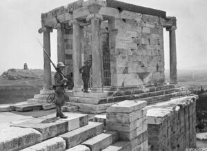 Στην δεύτερη ενότητα βλέπουμε «Ημέρες πολέμου», μέσα από φωτογραφίες που τραβήχτηκαν για προπαγανδιστικούς λόγους. Φυσικά και δεν πρόκειται για τουρίστες που τραβούν φωτογραφίες σε μια ταραγμένη και φορτισμένη ιστορική εποχή. Το πολυβόλο των Γάλλων συμμάχων είναι στημένο πάνω στην Ακρόπολη, σκοπιές περιπολούν πάνω και γύρω από τον Ιερό Βράχο, αξιωματικοί επιθεωρούν, ο Γάλλος στρατηγός ξεναγείται στην Ακρόπολη, στρατιωτικές σκηνές είναι στημένες στο ιερό του Διονύσου. Ένας φαντάρος μπαλώνει τη στολή του καθισμένος πάνω σε αρχαίο βωμό.
