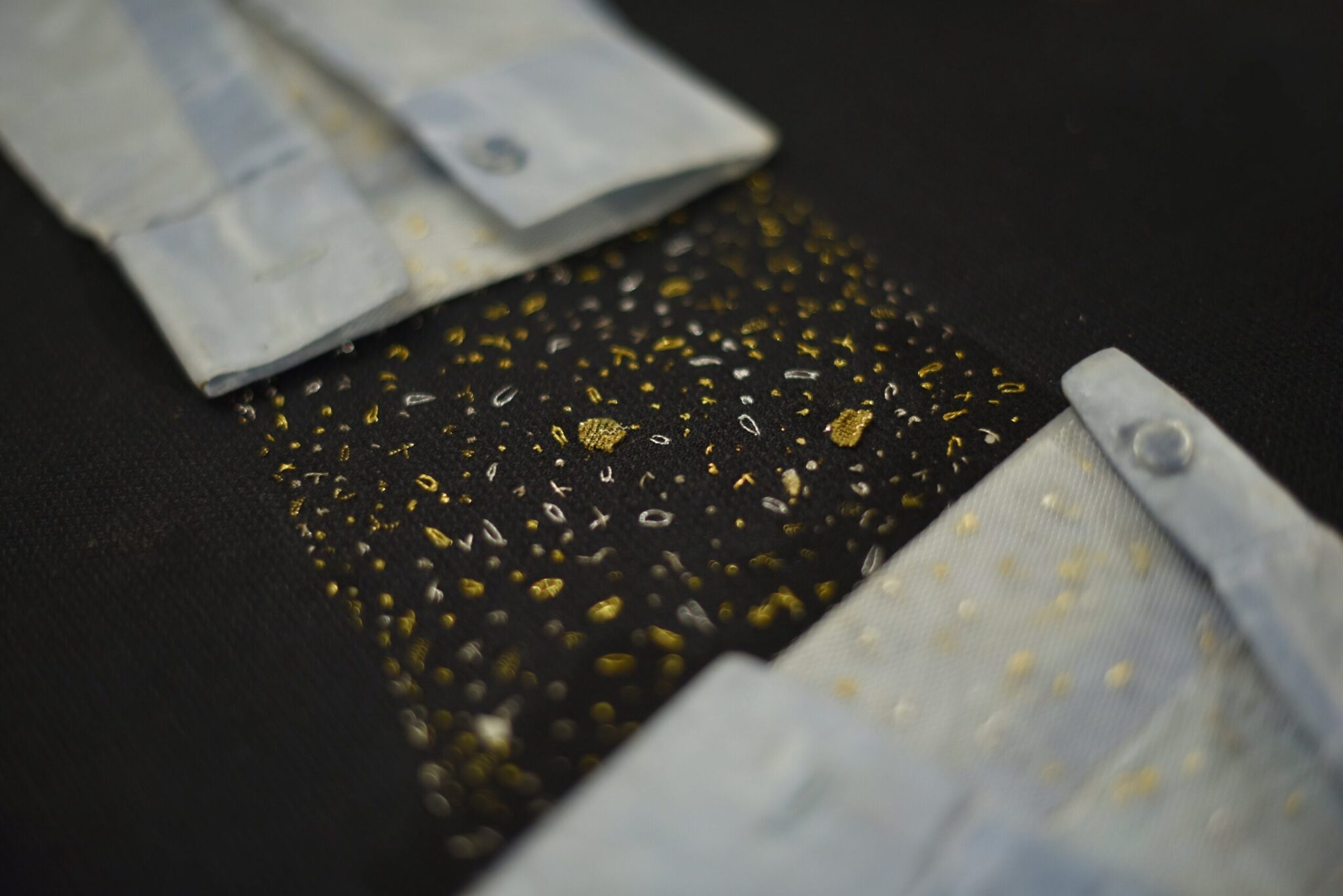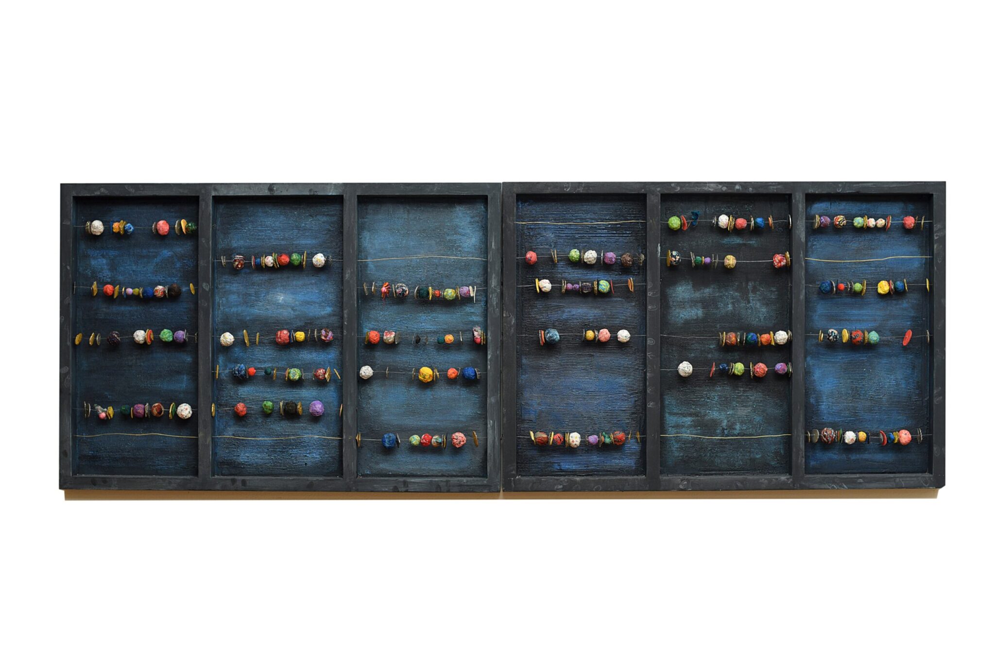 Οι υφασμάτινες συνθέσεις, τα αριθμητήρια με τις σειρές από κομποσκοίνια, τα φυλαχτά-κεντήματα και τα χαλάκια προσευχής πλαισιώνονται από παλιά μπαούλα γεμάτα με αναρίθμητα ρετάλια, τα οποία διαθέτουν «τεράστια ένταση», καθότι είναι η πηγή της δουλειάς. Κάποια από αυτά τα ρετάλια, κεντημένα, τοποθετούνται σε έναν καθρέφτη, σαν φωτογραφίες αγαπημένων προσώπων, που έχουμε την ανάγκη να μας συντροφεύουν και να τους απευθύνουμε καθημερινά έναν «συνεχή χαιρετισμό». Όπως στους γιαπωνέζικους κήπους, που το κλάδεμα των δέντρων αναδεικνύει το κενό και τη σημασία του, έτσι και εδώ ο χώρος ανάμεσα στις υφασμάτινες φωτογραφίες, εκεί όπου το βλέμμα σου εμπεριέχει τους άλλους, παρόντες και απόντες, αποδεικνύεται καθοριστικός.