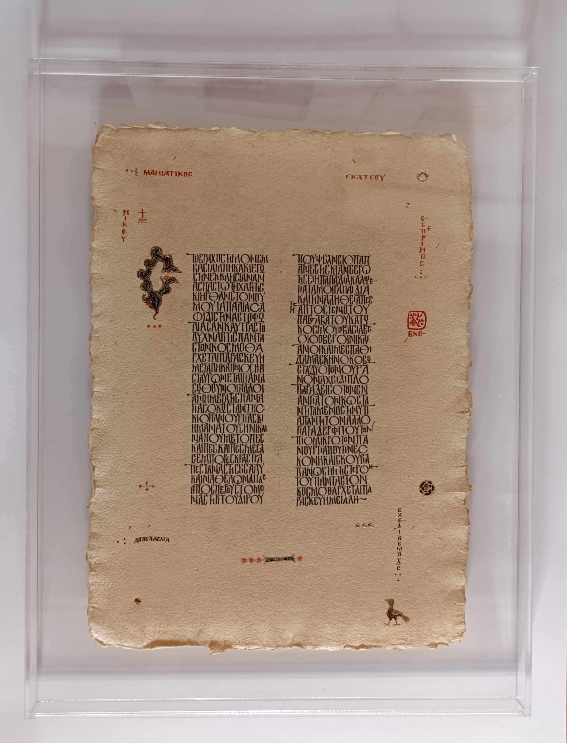 Την έκθεση συμπληρώνουν δύο έργα σε χειροποίητο κινέζικο χαρτί. Το πρώτο έργο είναι το ποίημα του Νίκου Γκάτσου «Μανιάτικος Εσπερινός» γραμμένο με κεφαλαιογράμματα Βυζαντινής γραφής και κοσμημένο με βυζαντινά σύμβολα από τα θρησκευτικά χειρόγραφα του Βυζαντίου και το δεύτερο το ποίημα του Λευκάδιου Χερν, «Είμαι εγώ ο ένας:» γραμμένο και κοσμημένο με τον ίδιο τρόπο.