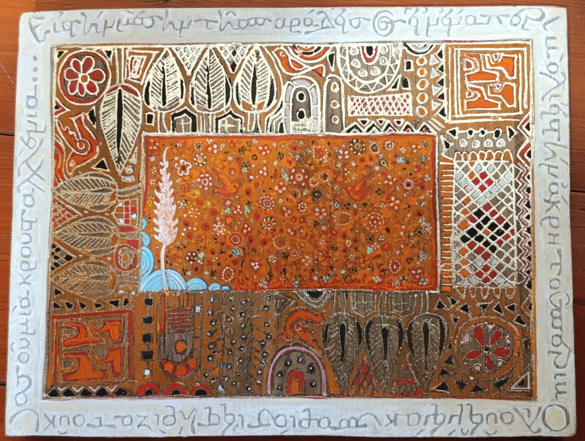 Αλλά και κάθε έργο ξεχωριστά είναι ένας μικρός κήπος που περικλείεται από περίτεχνα σύμβολα ή από στίχους μανιάτικων μοιρολογιών γραμμένων στη βυζαντινή γραφή.