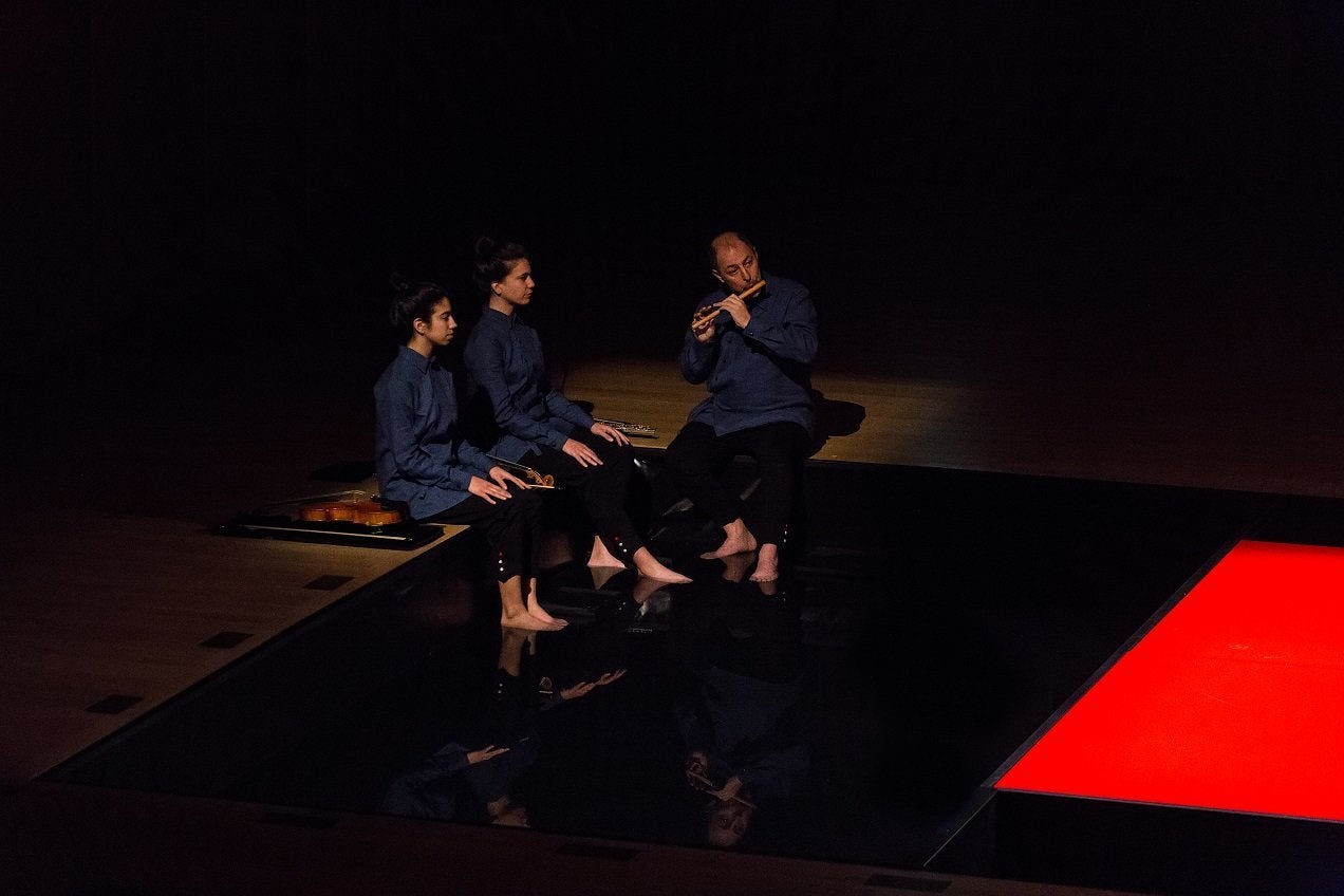 Δεν κρύβω πως στην αρχή είχα σκεφτεί περισσότερα όργανα. Κατέληξα στα τέσσερα μετά από σκέψη. Το φλάουτο είναι τμήμα της παράδοσης του Νο, όπως όμως και της παράδοσης ολόκληρης της ανθρωπότητας, είναι συνώνυμο σχεδόν με την ανάσα. Παίζω φλάουτο ο ίδιος στην παράσταση. Το κλαρινέτο το επέλεξα λόγω της εσωτερικότητας του ηχοχρώματός του, ιδανικό για να ντύσει τη σιωπή. Τα δύο έγχορδα, βιολί και βιόλα, μου προσφέρουν αρμονική στήριξη με τον πλούτο των ηχοχρωμάτων τους αλλά και αισθητική προέκταση με τον καθαρά «δυτικό» χαρακτήρα τους που τον ήθελα ως αντίστιξη.