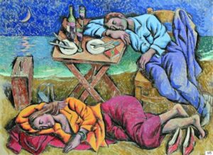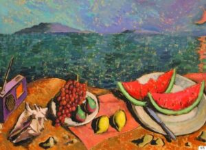Μια θαλασσινή περιήγηση στις παιδικές μας μνήμες, που είναι φορτωμένες με τις γυναίκες και τους δράκους του Παύλου Σάμιου, τα νωχελικά καφενεία του, κυρίως δε, με και τις νεκρές φύσεις του: εκεί που η ανθρώπινη παρουσία «μιλάει» μέσα από τις κόκκινες ψηλοτάκουνες γόβες ή το κουτί τσιγάρων, το κόκκινο Σαντέ και τον αναπτήρα πλάι στα άδεια πιάτα.