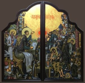 Αντλώντας εικονογραφικά πρότυπα από τη χριστιανική παράδοση – τη γαλακτοτροφούσα μητέρα, το θείο βρέφος και τη μορφή του Ευαγγελιστή -, αλλά και με αναφορές από τον συμβολικό κόσμο του Φλαμανδού Μπρύγκελ – στο τάμπλετ που ίπταται με φτερά και στα αντικείμενα που αποκτούν υπόσταση με δύναμη στα χέρια -, ο Φαϊτάκης βάζει στο επίκεντρο τον σύγχρονο άνθρωπο ως «άγιο» στρατιώτη. Είναι μια παράταιρη, ετερόκλιτη ομάδα κοινωνικών χαρακτήρων από τον αστυνομικό, τη λαϊκή γυναίκα, τον μοδάτο καλοντυμένο ως τον τραμπούκο κοιλαρά που κρατάει μαχαίρι. Έχουμε μια θυελλώδη κίνηση ανθρώπινου πλήθους, ¬προσφιλές θέμα στην εικονοποιία του ζωγράφου–, όπου οι μορφές συνωθούνται με σφοδρότητα. Όλοι τους επιτίθενται με σφοδρότητα σε έναν «ταχυδρόμο», που από την ένταση χάνει το πακέτο που μεταφέρει. Τα δύο φύλλα του βημόθυρου συνδέει ένας φλεγόμενος ήλιος που κατακαίει ό,τι αναγνωρίζουμε ως τεχνολογικό πολιτισμό. Σε αυτό το ρημαδιό με τα μισοκατεστραμμένα κτήρια και τα χαλάσματα προβάλλουν τα ανθρώπινα σαν καταλύτης της ιστορίας, αλλιώς η Ιστορία σαν Πάθη. Και ο Φαϊτάκης, χωρίς να είναι πιστός, ευαγγελίζεται σαν εσχατολογική προφητεία την «ανάσταση» του ανθρώπου στο τέλος της δογματικής επιστήμης.