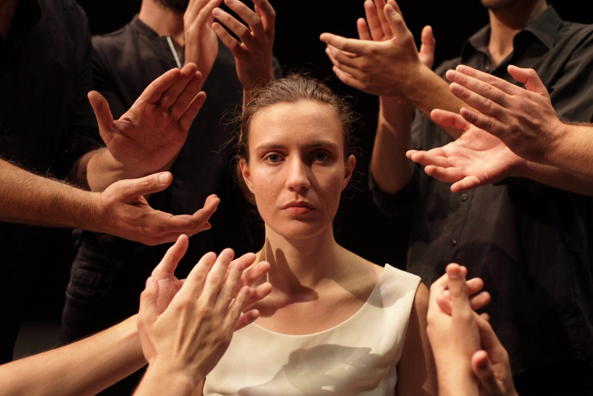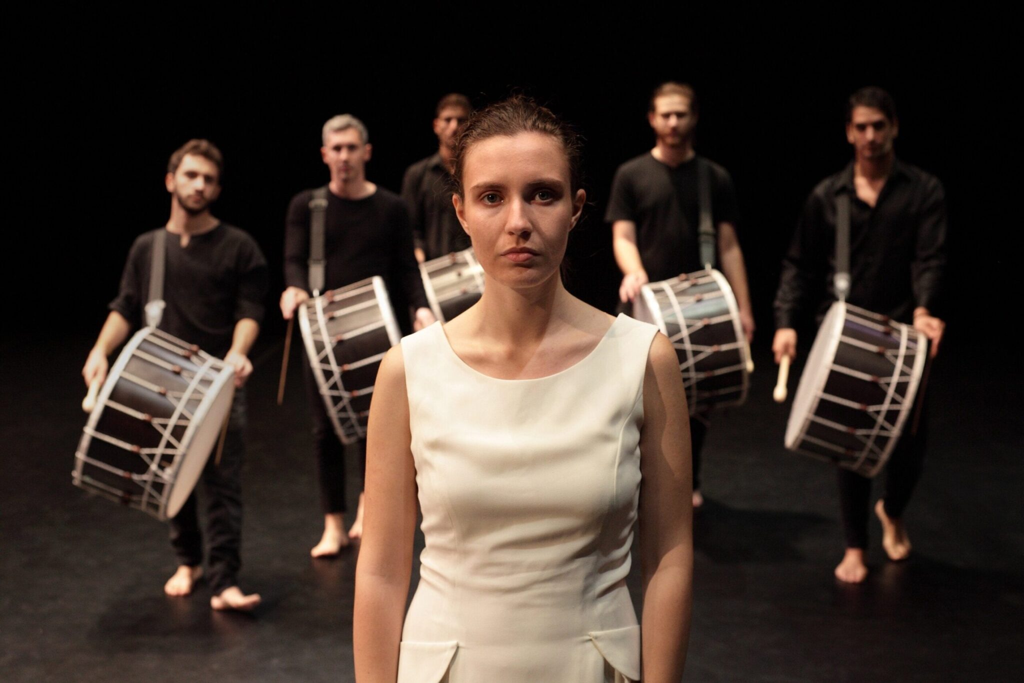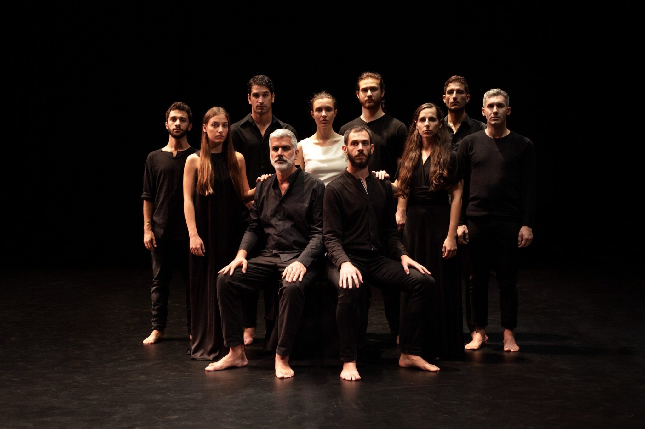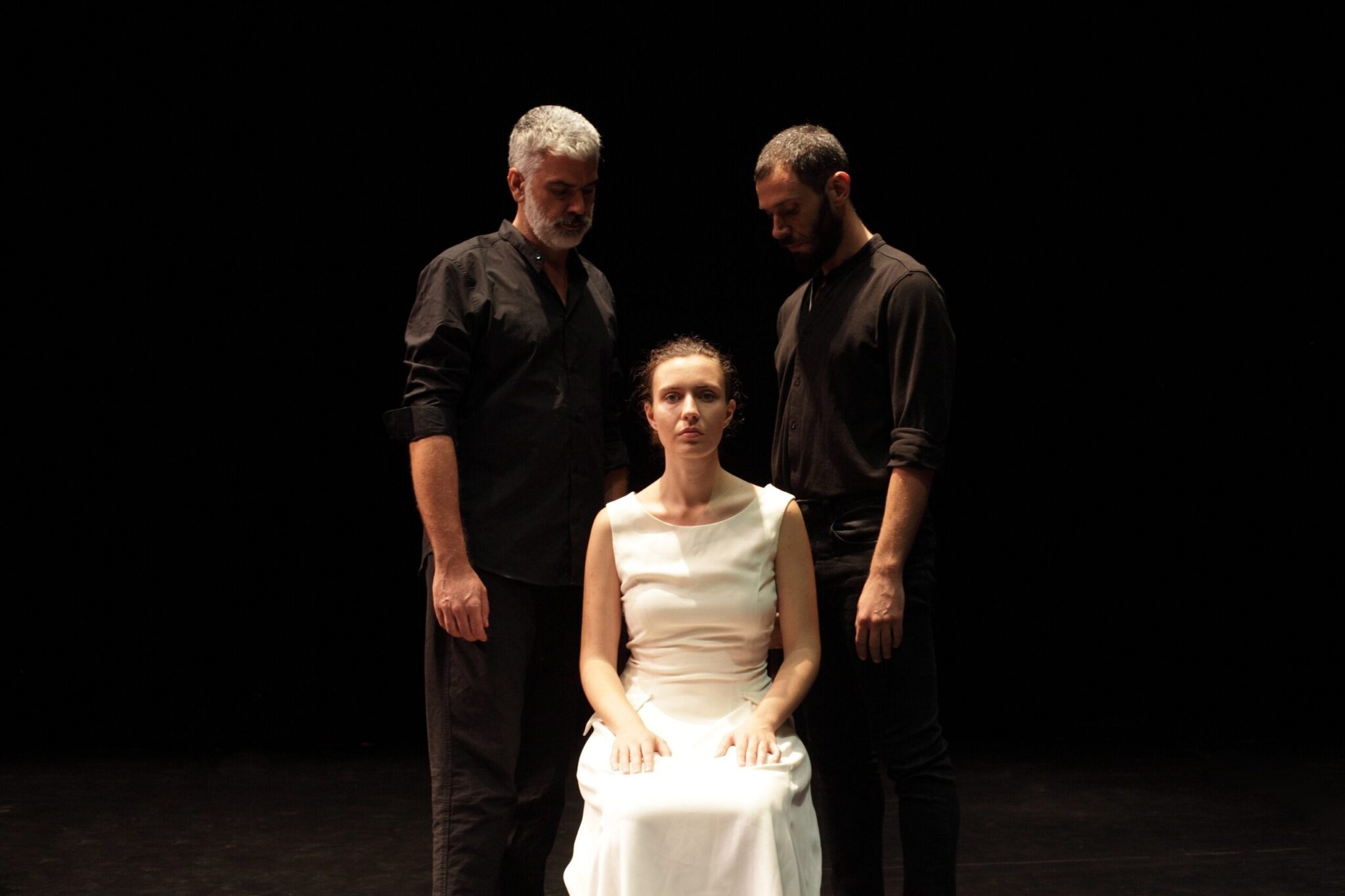 Δέκα ηθοποιοί, επτά άντρες και τρεις γυναίκες, αρχίζουν σιγά – σιγά να γεμίζουν την σκηνή. Ολοι και όλες ντυμένοι/ες στα μαύρα εκτός από την κοπέλα στο κέντρο της σκηνής η οποία φοράει ένα ολόλευκο φόρεμα. Μερικοί από τους άντρες της φέρνουν λίγα ακόμα λευκά τμήματα για να συμπληρώσει την ενδυμασία της ενώ δύο μόνο μουσικοί κάθονται στα όργανα τους στο ένα υπερυψωμένο άκρο της σκηνής. Η παράσταση αρχίζει…