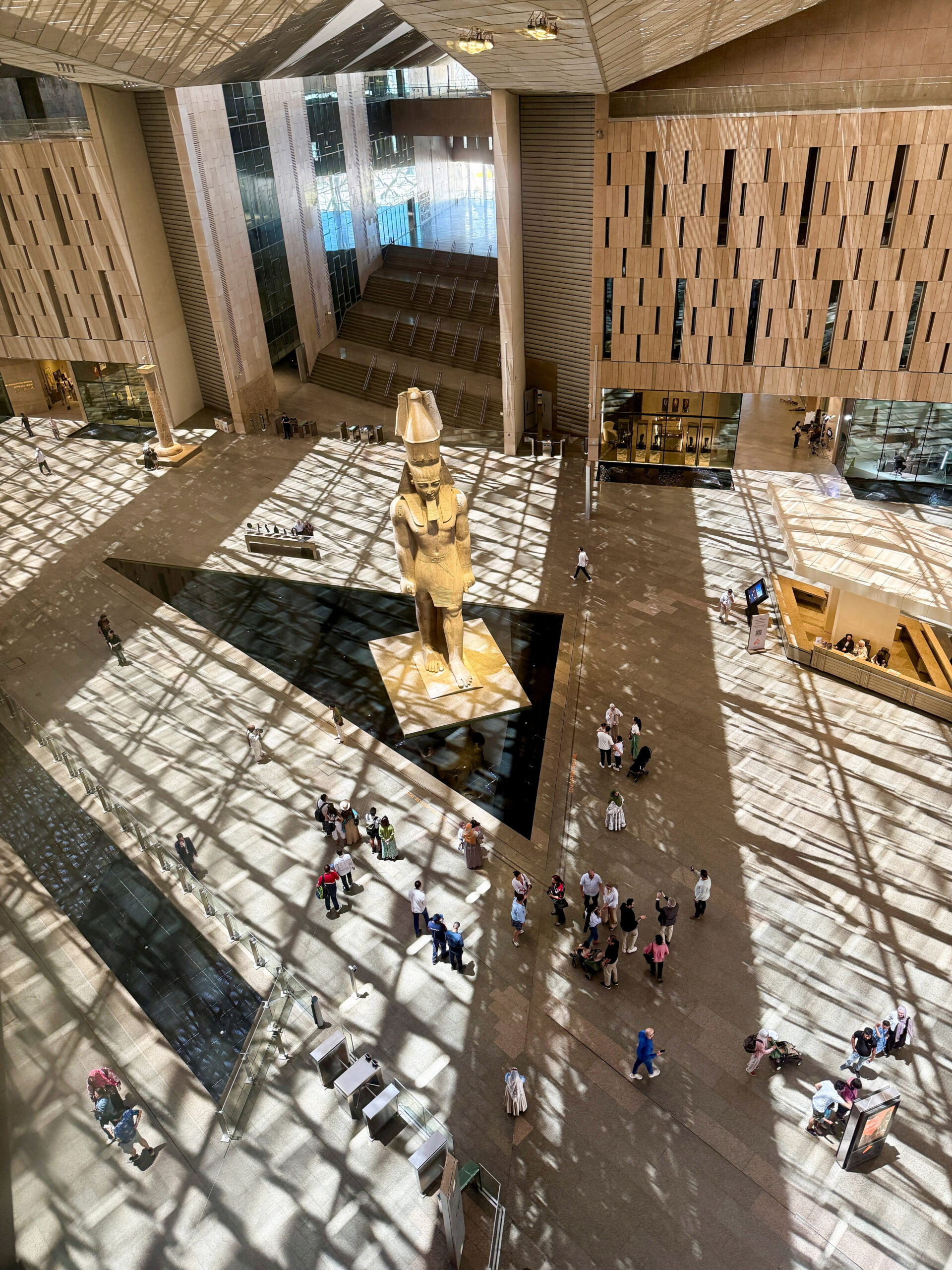 Tarek Tawik: Στην τεράστια είσοδο αντικρίζεις το κολοσσιαίο άγαλμα του Ραμσή Β΄, ύψους δώδεκα μέτρων και βάρους 83 τόνων από ροζ γρανίτη. Ακολουθεί μια μεγάλη σκάλα, όπως εκείνης στο Μουσείο της Ακρόπολης, η οποία πλαισιώνεται από εβδομήντα κολοσσιαία αγάλματα και πολύ εντυπωσιακά αρχιτεκτονικά μέλη ναών, κίονες, πύλες. Στο τέλος αυτής της μεγαλοπρεπούς κλίμακας, βρίσκεται μια γυάλινη πρόσοψη ύψους 25 μέτρων από την οποία βλέπεις τις πυραμίδες. Εκεί, θα πρέπει να αποφασίσει κανείς αν θα προχωρήσει δεξιά προς τις αίθουσες του Τουτανχαμών ή αριστερά προς τις χρονολογικές αίθουσες για να παρακολουθήσεις την ιστορία της αρχαίας Αιγύπτου διάρκειας πάνω από 3.000 χρόνια. Ο κύριος άξονας είναι αμιγώς χρονολογικός, ενώ ο δεύτερος είναι θεματικός, λ.χ. ένας παρουσιάζει την κοινωνία, ένα άλλο θέμα είναι η ζωή μετά τον θάνατο…