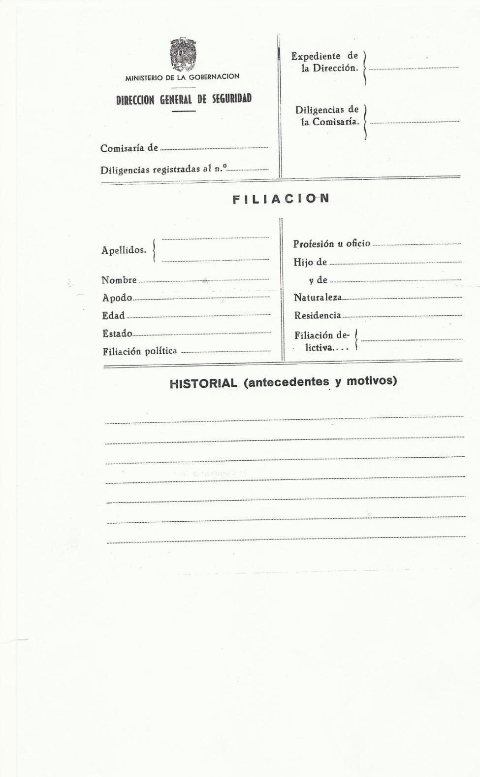 Στην Ασφάλεια μας απευθύνουν κατηγορία για… εξοπλισμό των ανταρτών στα βουνά. Έτσι μάθαμε ότι ο Ισπανικός εμφύλιος πόλεμος δεν είχε τελειώσει! Και άρχισε η ανάκριση. Ύστερα ήρθαν με ένα πακέτο επίσημα δελτία της Ασφάλειας και μας φακέλωσαν αντιγράφοντας τα διαβατήριά μας. Ύστερα έφυγαν και μας άφησαν μόνους. Αλλά είχαν ξεχάσει το πακέτο! Οπότε πήρα ένα δελτίο για σουβενίρ, πριν μας αφήσουν ελεύθερους επιτέλους. Πάντως με ένα τέτοιο δελτίο ανοίχτηκε ο ισπανικός μου φάκελός. Και φυσικά περίμενα να πεθάνει ο Φράνκο για να ξαναπάω στην Ισπανία. Αυτό δεν με εμπόδισε να του γράψω μια επιστολή τον επόμενα χρόνο! Στον Φράνκο! Με την υπογραφή του Έλληνα Πρωθυπουργού βέβαια, του οποίου βρέθηκα γραμματέας στα αγγλικά με εντολή του Γενικού Επιτελείου Στρατού όταν έκανα την θητεία μου.