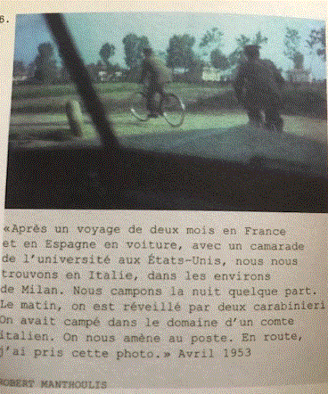 Στη Γαλλία δεν μας ενόχλησε κανείς. Αλλά θα έχουμε μια περιπέτεια στην Ιταλία. Λίγα χιλιόμετρα έξω από το Μιλάνο. Είχαμε μείνει δύο από την παρέα. Ο τρίτος πήγε να δει τον πατέρα του στο Βερολίνο το κατεχόμενο ακόμα από τις τέσσερις νικήτριες δυνάμεις. Είμαστε στο 1953. Τα δολάρια μας άρχισαν να λιγοστεύουν και οι δύο που μείναμε βρήκαμε έναν ωραίο κήπο για να κοιμηθούμε στο αυτοκίνητο. Το πρωί μας ξύπνησαν δύο συμπαθητικοί Ιταλοί χωροφύλακες που ήρθαν με τα ποδήλατά τους.
