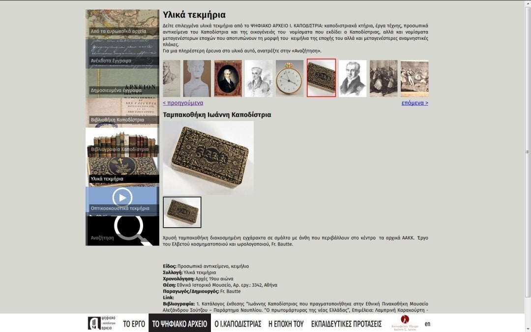 Στο πλαίσιο του έργου, μεταξύ άλλων,ψηφιοποιήθηκαν 13.000 τεκμήρια της αρχειακής συλλογής του Ιωάννη Καποδίστρια που φιλοξενείται στα Γενικά Αρχεία του Κράτους στην Κέρκυρα, αναρτήθηκαν 276 τεκμήρια όπως προσωπογραφίες, πίνακες ζωγραφικής, φωτογραφίες προσωπικών αντικειμένων, ντοκιμαντέρ, τηλεοπτικές εκπομπές κ.ά., παρουσιάστηκε η πλούσια βιβλιοθήκη που είχε ο Καποδίστριας και συγκεντρώθηκαν 714 τίτλοι επιστημονικών μελετών που έχουν συγγραφεί περί τον Καποδίστρια από το 1831 έως το 1996. Επιπλέον διοργανώθηκε ημερίδα στην Αίγινα για εκπαιδευτικούς σε σχέση με τις δυνατότητες αξιοποίησης του Αρχείου μέσα στην εκπαιδευτική διαδικασία.