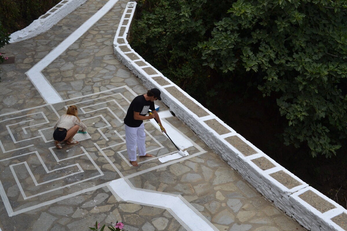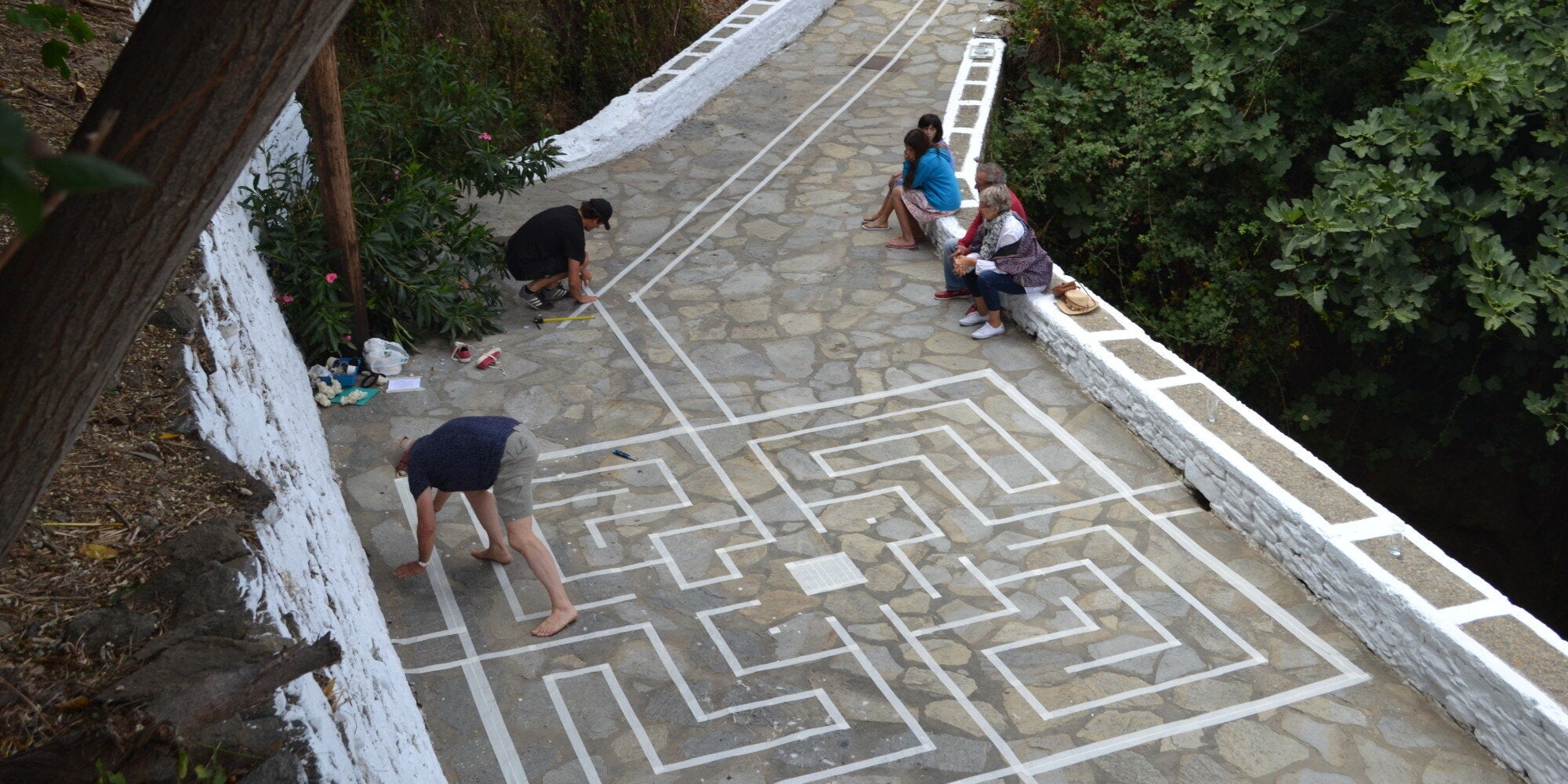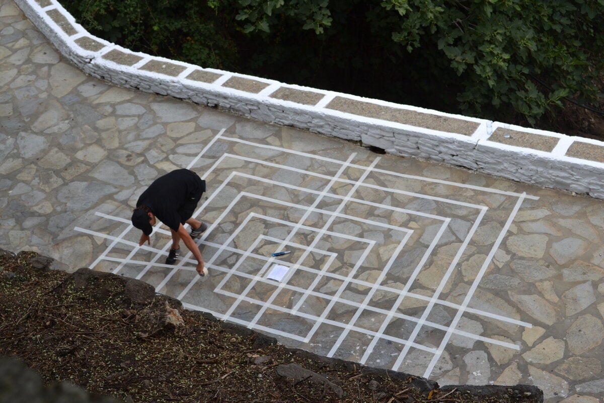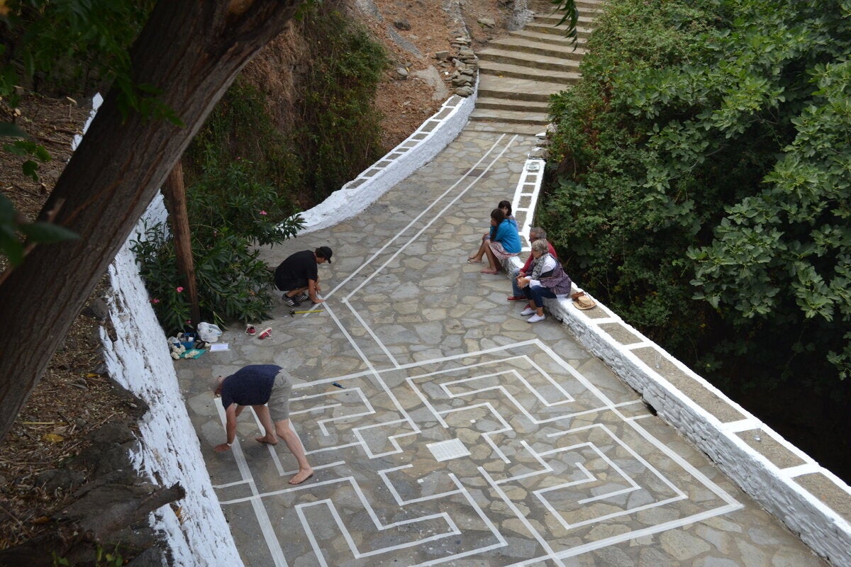 «Το θέμα του λαβυρίνθου» σημειώνει η επιμελήτρια της έκθεσης, Mireille Lienard, «προέκυψε από το σχέδιο των διαδρομών που δημιουργούν τα σοκάκια στα κυκλαδίτικα χωριά. Συνήθως, είναι ελικοειδείς διαδρομές που τονίζονται από παρακάμψεις, αλλαγές πορείας και αδιέξοδα, αναγκάζοντας αυτόν που τα διασχίζει να επιβραδύνει, να σταματήσει».