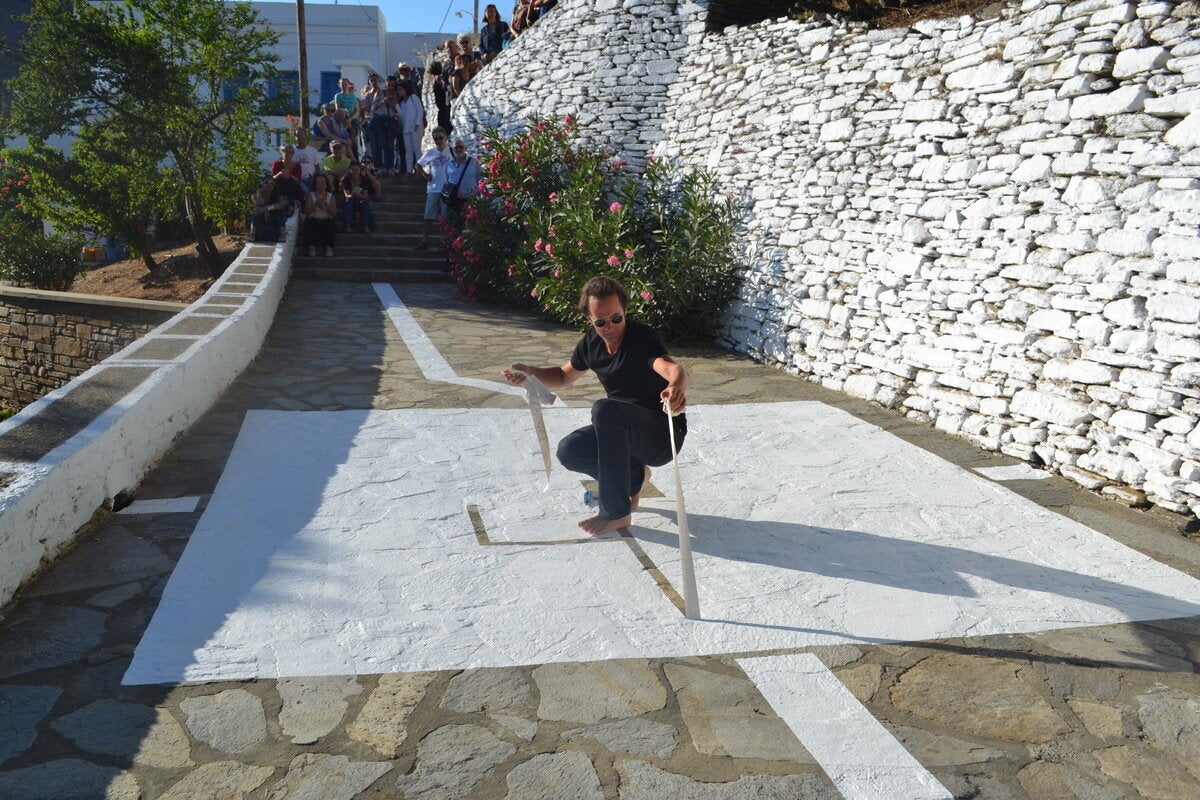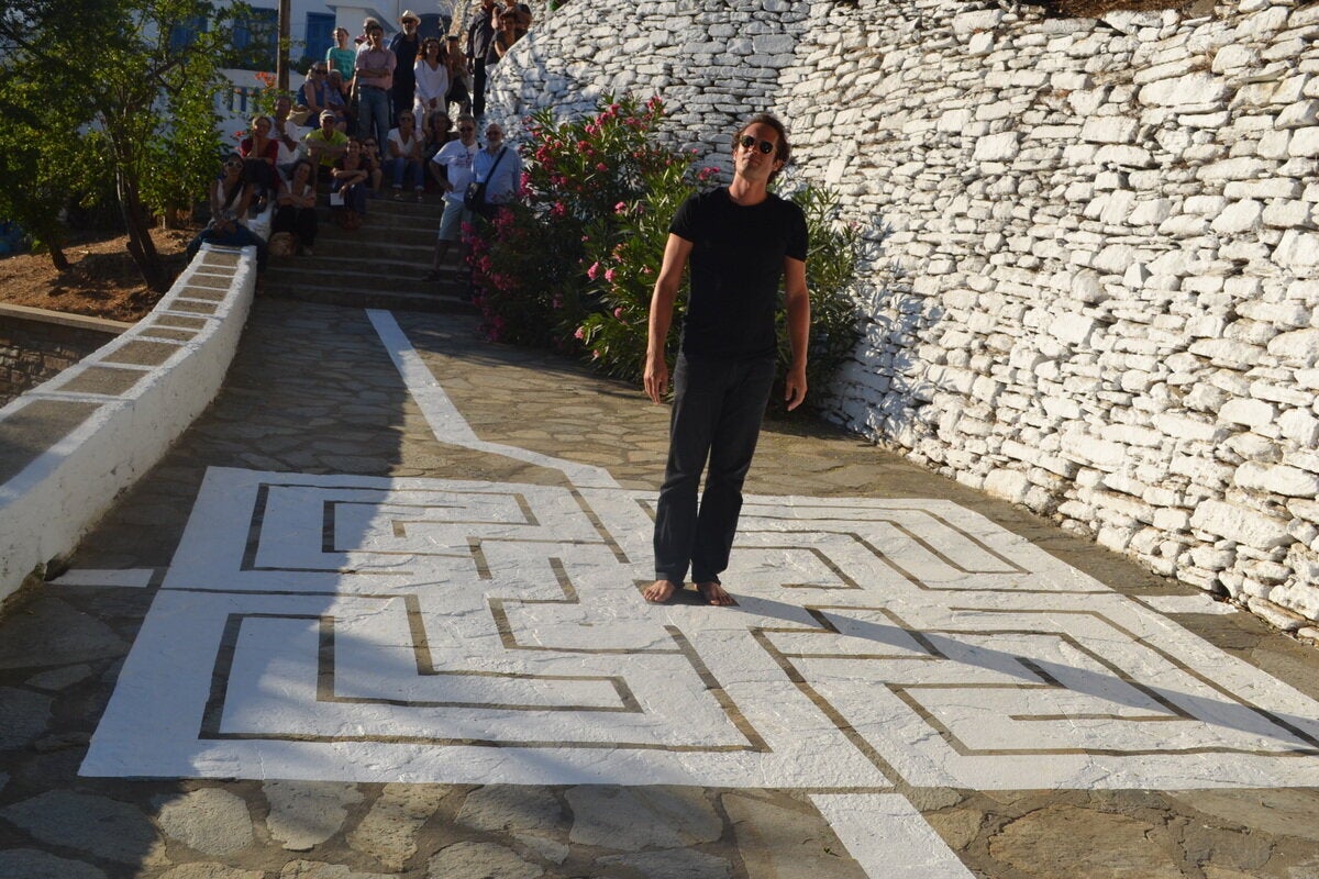 Έχει φιλοτεχνήσει μνημειακά έργα στην καρδιά της Ευρώπης, στο κέντρο Pombidou, στην place du Palais Royal και στα Ηλύσια Πεδία στο Παρίσι, ενώ έχει προσκληθεί σε διεθνή εικαστικά κέντρα, όπως το πάρκο Ροκφέλερ της Νέας Υόρκης και το Κέντρο Τέχνης της Σεούλ. Ο διεθνούς φήμης γκραφιτάς L’ATLAS άφησε τον δικό του «λαβύρινθο» στη δεύτερη «Μικρή Μπιενάλε» που φιλοξενείται στο Μουντάδο της Τήνου. Γνωστός για τις περφόρμανς που εκτελεί σε ιστορικά μέρη, ο Γάλλος εικαστικός παίρνει το κλασικό σχεδιάγραμμα του λαβύρινθου ως αρχετυπική μορφή κι επιχειρεί να το αναγάγει σε εικαστικό ιδεόγραμμα, επάνω στη γέφυρα του χωριού της Τήνου.