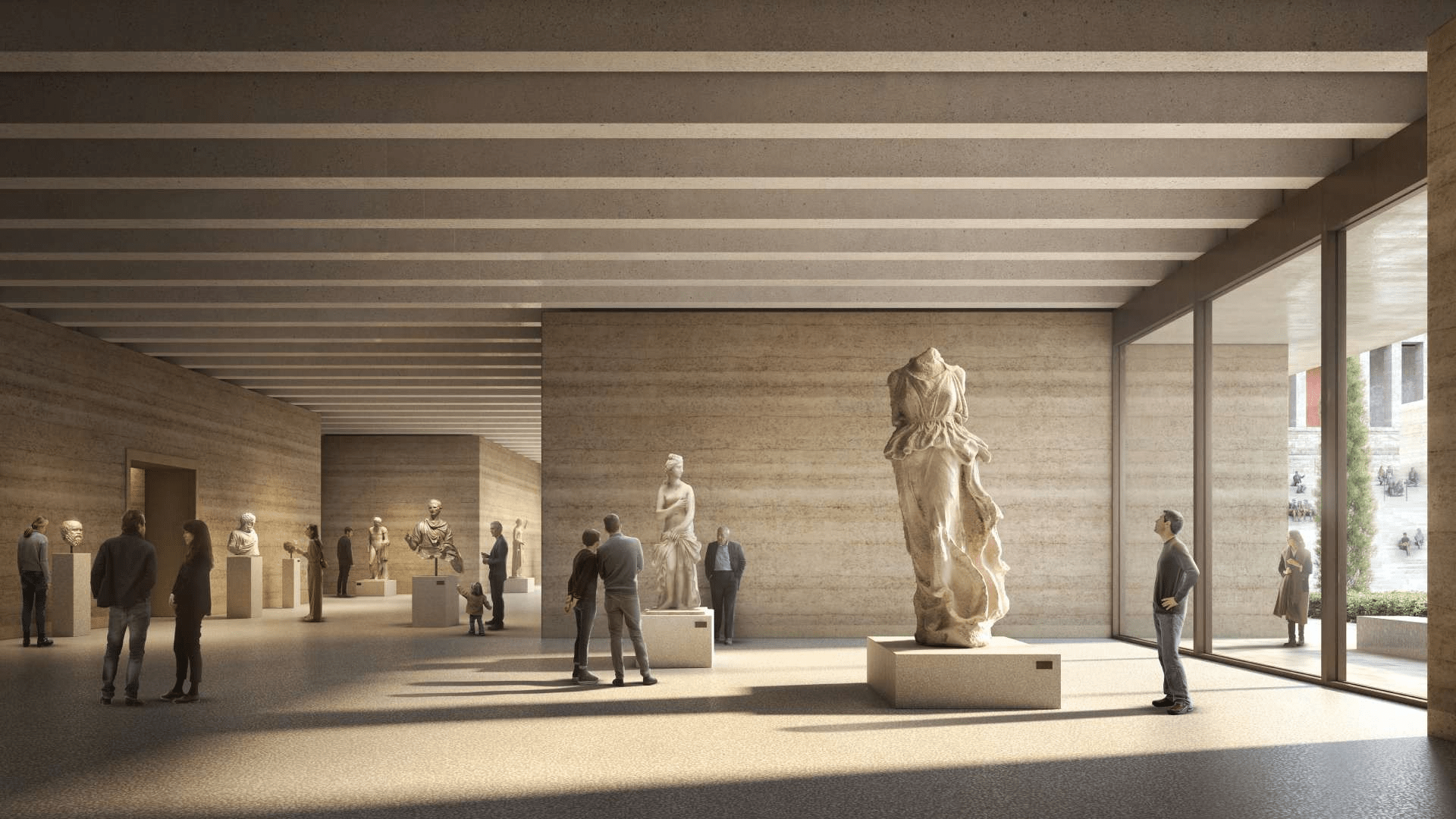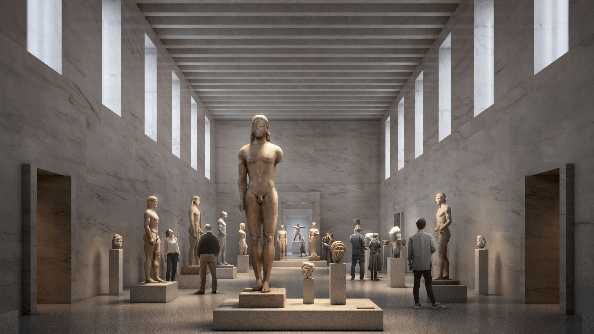 Η εγκεκριμένη κεντρική μουσειολογική ιδέα περιλαμβάνει μια πλήρη διαδρομή επισκεπτών, που σκιαγραφεί την εξέλιξη του ελληνικού πολιτισμού από τη Νεολιθική Εποχή έως την Ύστερη Αρχαιότητα. Η πλήρης ξενάγηση στην έκθεση καθοδηγεί τον επισκέπτη σε τέσσερα διαφορετικά κτηριακά επίπεδα, δύο στην επέκταση και δύο στο κτήριο-μνημείο. Για να προσφέρει στον επισκέπτη μια σαφή αφήγηση και προσανατολισμό, τόσο στην επέκταση όσο και στο μνημείο, εισάγεται ένας κεντρικός άξονας. Ο άξονας στο κάτω επίπεδο της επέκτασης οργανώνεται γύρω από ένα κεντρικό αίθριο, προσφέροντας φυσικό φως και προσανατολισμό, ενώ παράλληλα εκθέτει βασικά αντικείμενα που αντιπροσωπεύουν τις διαφορετικές εκθεσιακές εποχές. Στο κτήριο-μνημείο, η αλληλουχία των εκθεσιακών αιθουσών κατά μήκος του κεντρικού άξονα προσφέρει ποικίλες κλίμακες και συνθήκες φυσικού φωτισμού για να βελτιώσει την εμπειρία του επισκέπτη. Η εξέλιξη της ελληνικής γλυπτικής με την πάροδο του χρόνου παρουσιάζεται από την αρχαϊκή έως την κλασική Εποχή, καθώς ο επισκέπτης μετακινείται από τη μία αίθουσα στην άλλη.