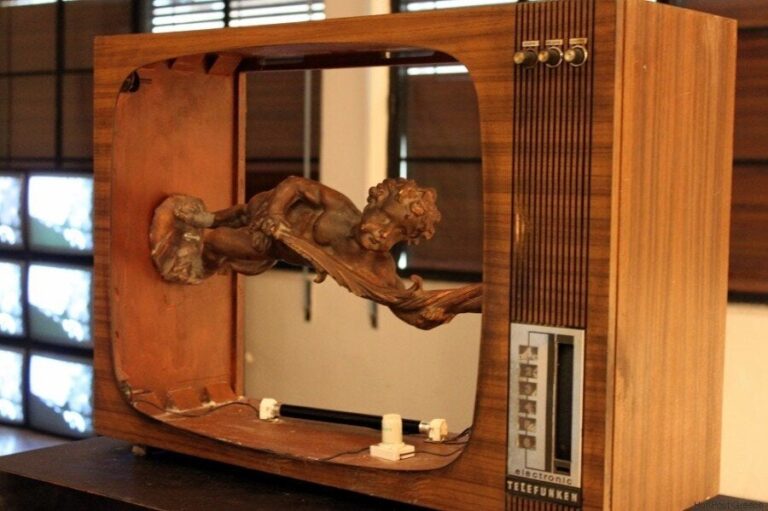 «Όταν ξεκινάει η video art στην Αμερική τη δεκαετία του ’60, σημαίνει πράγματα σαν αυτό εδώ. Ήταν περισσότερο δηλαδή ένα είδος γλυπτικής, όπου χρησιμοποιούνται οι συσκευές, η τηλεόραση και το βίντεο, ως αντικείμενα. Άλλωστε, δεν μπορούσες να φανταστείς εκείνη την εποχή το σαλόνι χωρίς τηλεόραση».