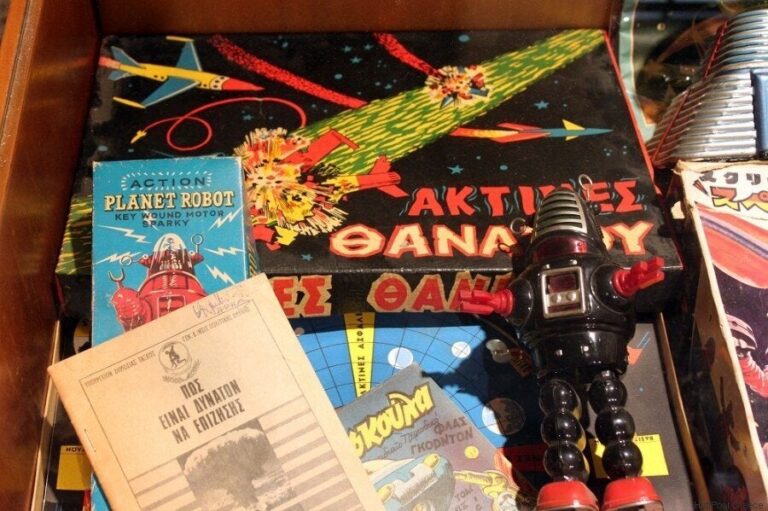«Εμείς βέβαια έχουμε αυτό (και μου δείχνει τον καραγκιόζη αστροναύτη). Για να σοβαρευτούμε, όμως, τι σήμαινε κάποτε το διάστημα και η ανακάλυψή του σε μια μικρή χώρα, όπως η Ελλάδα; Την απάντηση έδιναν τα παιδάκια που απαντούσαν αυθόρμητα στο ερώτημα τι θέλεις να γίνεις όταν μεγαλώσεις; Αστροναύτης. Έχουμε παιχνίδια στις βιτρίνες που είτε κατασκευάστηκαν στη χώρα μας, είτε εισήχθησαν κι αφορούν την έννοια του διαστήματος. Αντικείμενα μιας μοναδικής συλλογής, αληθινά δυσεύρετα».