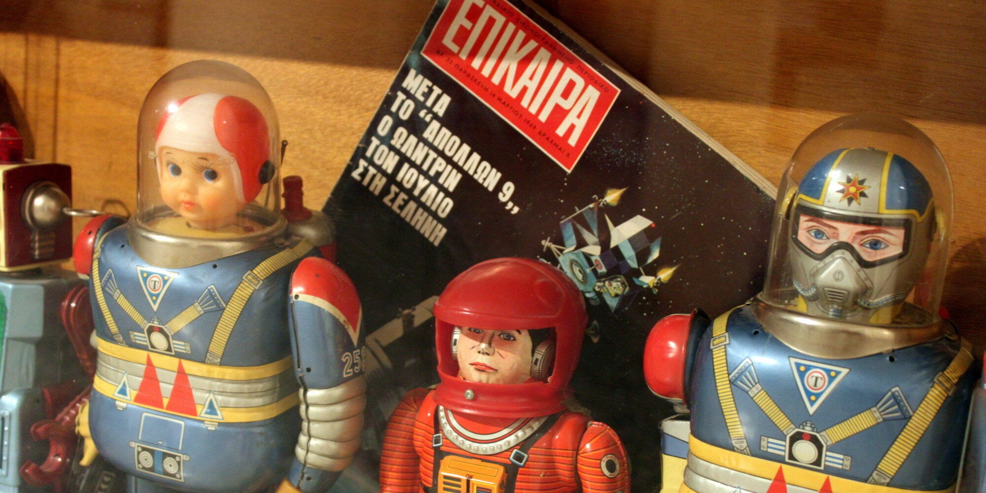 «Εμείς βέβαια έχουμε αυτό (και μου δείχνει τον καραγκιόζη αστροναύτη). Για να σοβαρευτούμε, όμως, τι σήμαινε κάποτε το διάστημα και η ανακάλυψή του σε μια μικρή χώρα, όπως η Ελλάδα; Την απάντηση έδιναν τα παιδάκια που απαντούσαν αυθόρμητα στο ερώτημα τι θέλεις να γίνεις όταν μεγαλώσεις; Αστροναύτης. Έχουμε παιχνίδια στις βιτρίνες που είτε κατασκευάστηκαν στη χώρα μας, είτε εισήχθησαν κι αφορούν την έννοια του διαστήματος. Αντικείμενα μιας μοναδικής συλλογής, αληθινά δυσεύρετα».
