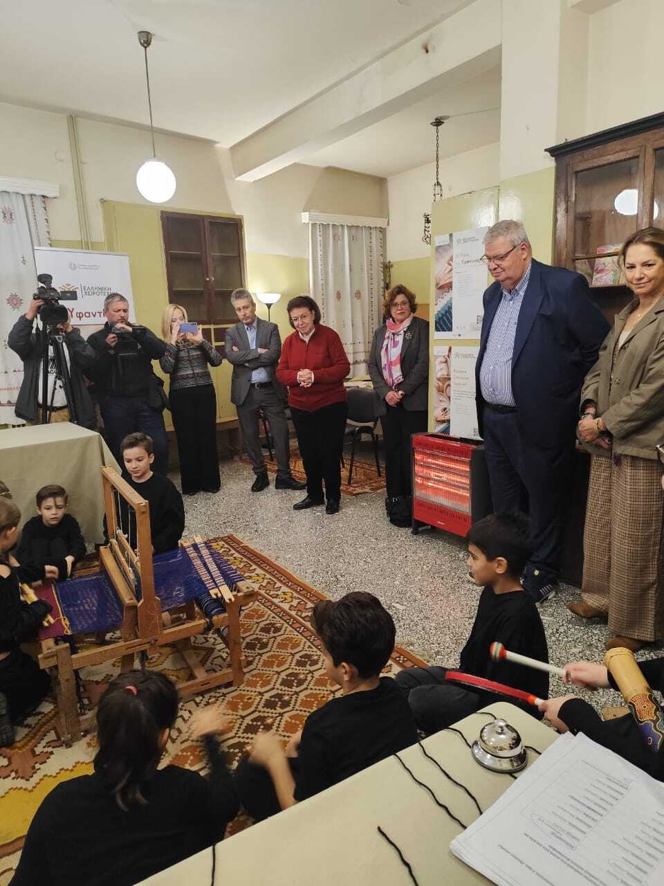 Στη συνέχεια, η Λίνα Μενδώνη επισκέφθηκε τη Δομή Κατάρτισης Υφαντικής, που φιλοξενείται στο Μέκειο Οικοτροφείο Ιωαννίνων, όπου συνομίλησε με εκπαιδευτές και εκπαιδευόμενους, είδε τα έργα τους και ενημερώθηκε για την πορεία των μαθημάτων και των εργαστηρίων. Ξεχωριστή στιγμή ήταν η αναπαράσταση του μύθου της Αράχνης από τους μαθητές της Γ’ Δημοτικού του Αρσακείου Σχολείου Ιωαννίνων.