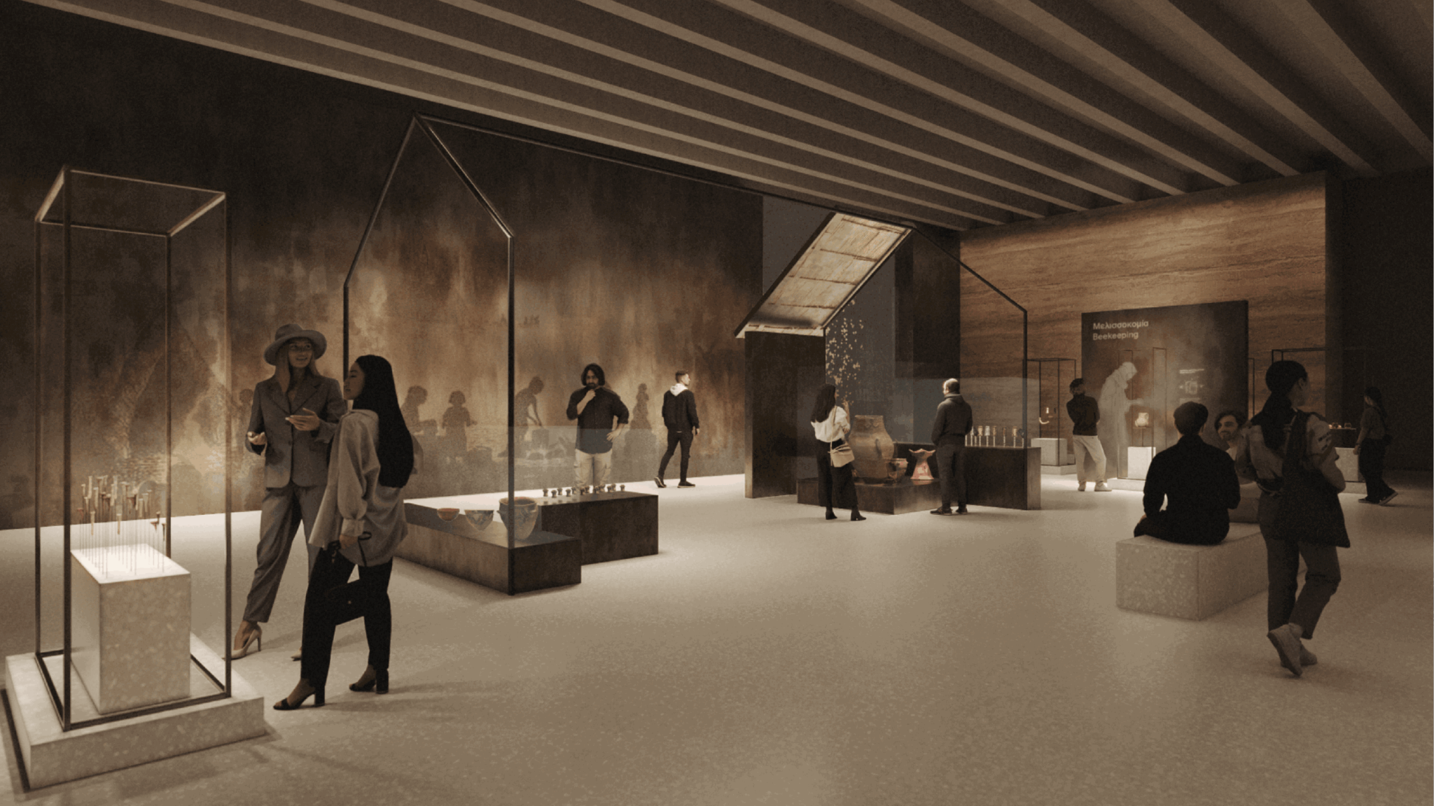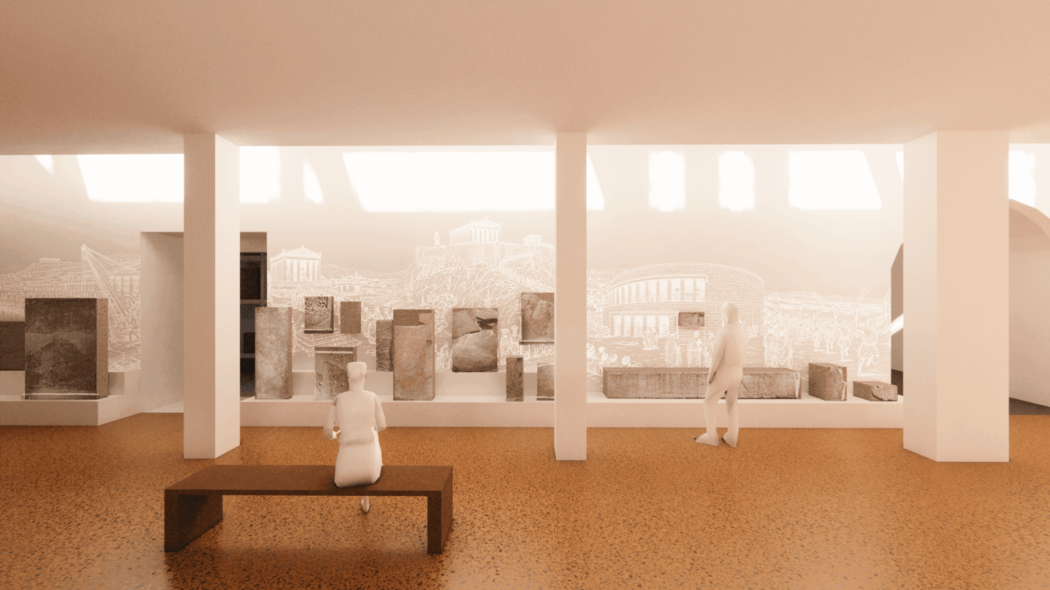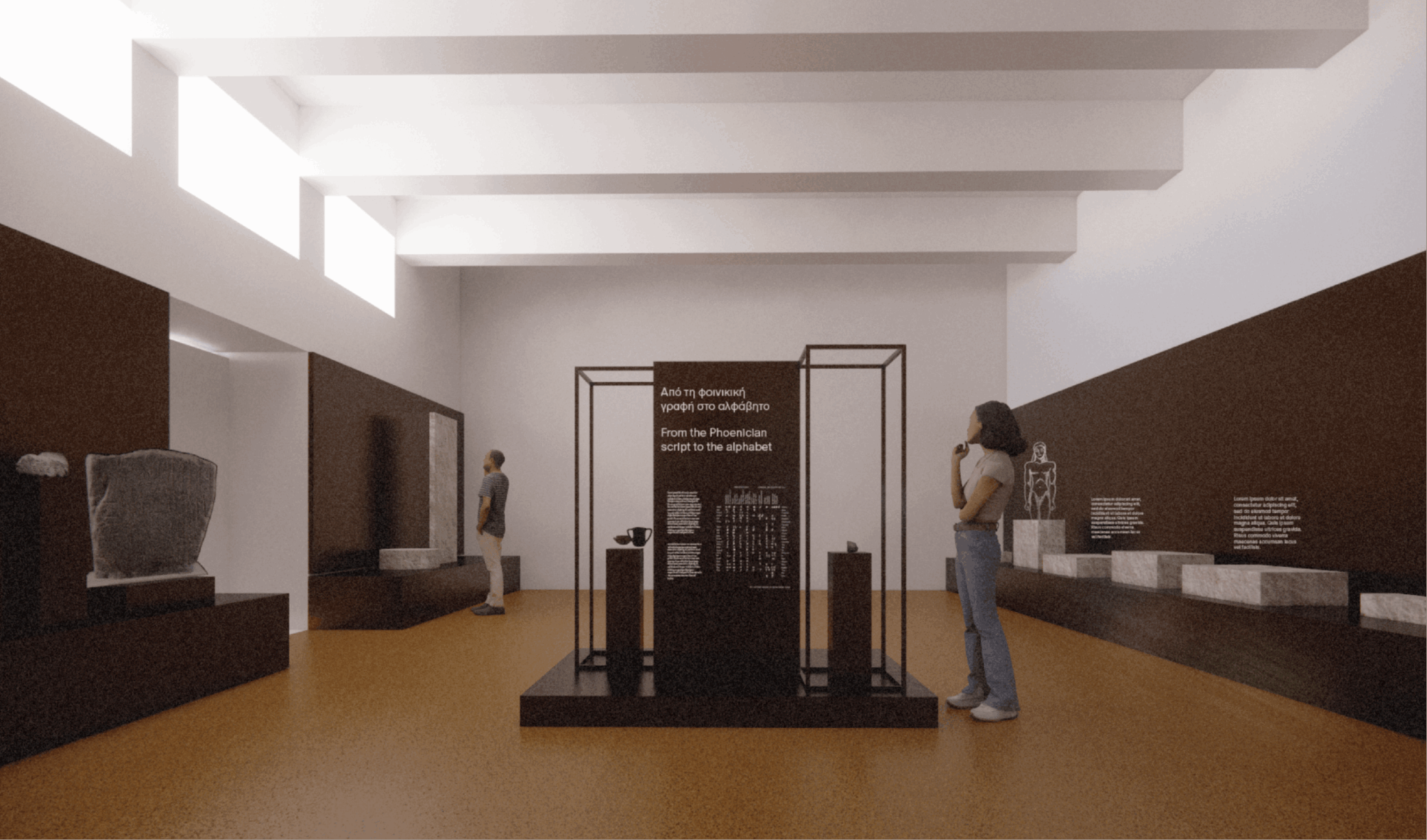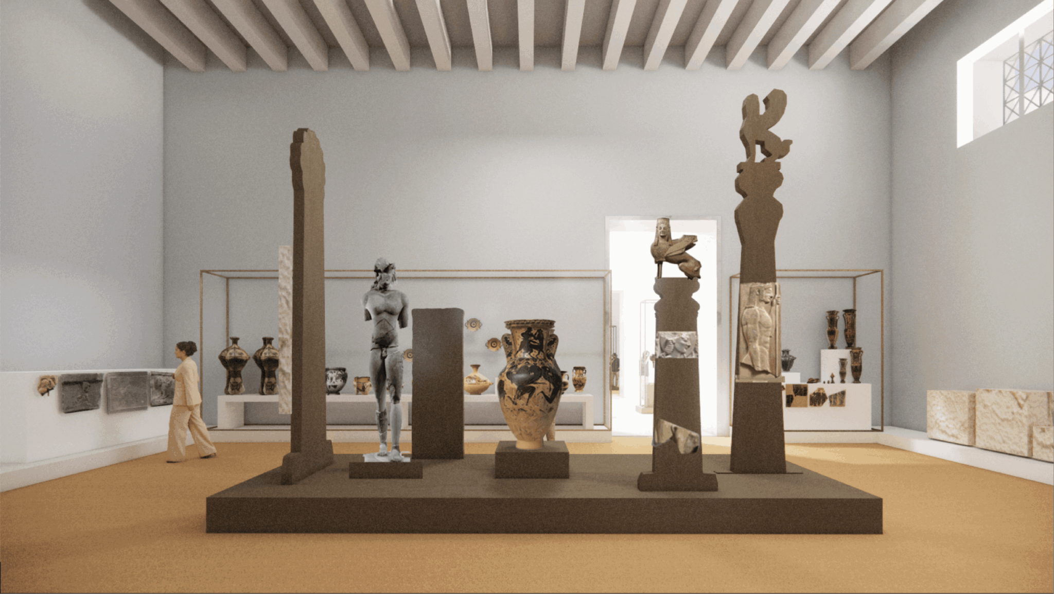 – στην οργάνωση των βασικών εκθεσιακών ενοτήτων. Στο ΕΑΜ εστιάζει στην ανάδειξη και χωροθέτηση της εισαγωγής και του επιλόγου της έκθεσης, στην παρουσίαση του «κεντρικού άξονα», ο οποίος δομείται γύρω από εμβληματικά αντικείμενα – εκθέματα, παράλληλα με τον κεντρικό και τους γύρω από αυτόν, άξονες. Για το Επιγραφικό Μουσείο, η παρουσίαση της έκθεσης αναπτύσσεται σε τρία επίπεδα (έκθεση σε νησίδες, ελεύθερα μνημεία, πανόραμα, ανοικτή αποθήκευση και έρευνα).