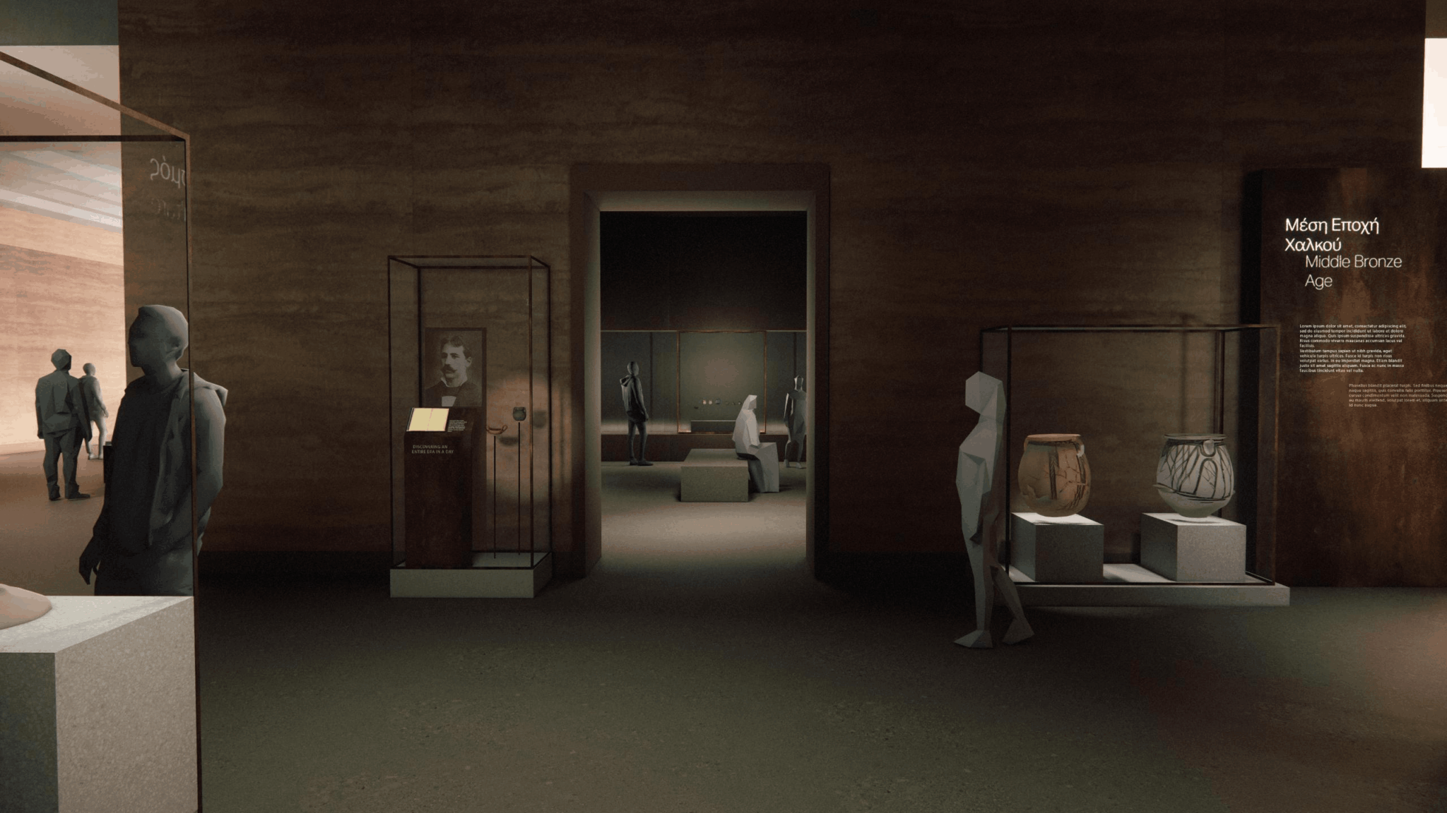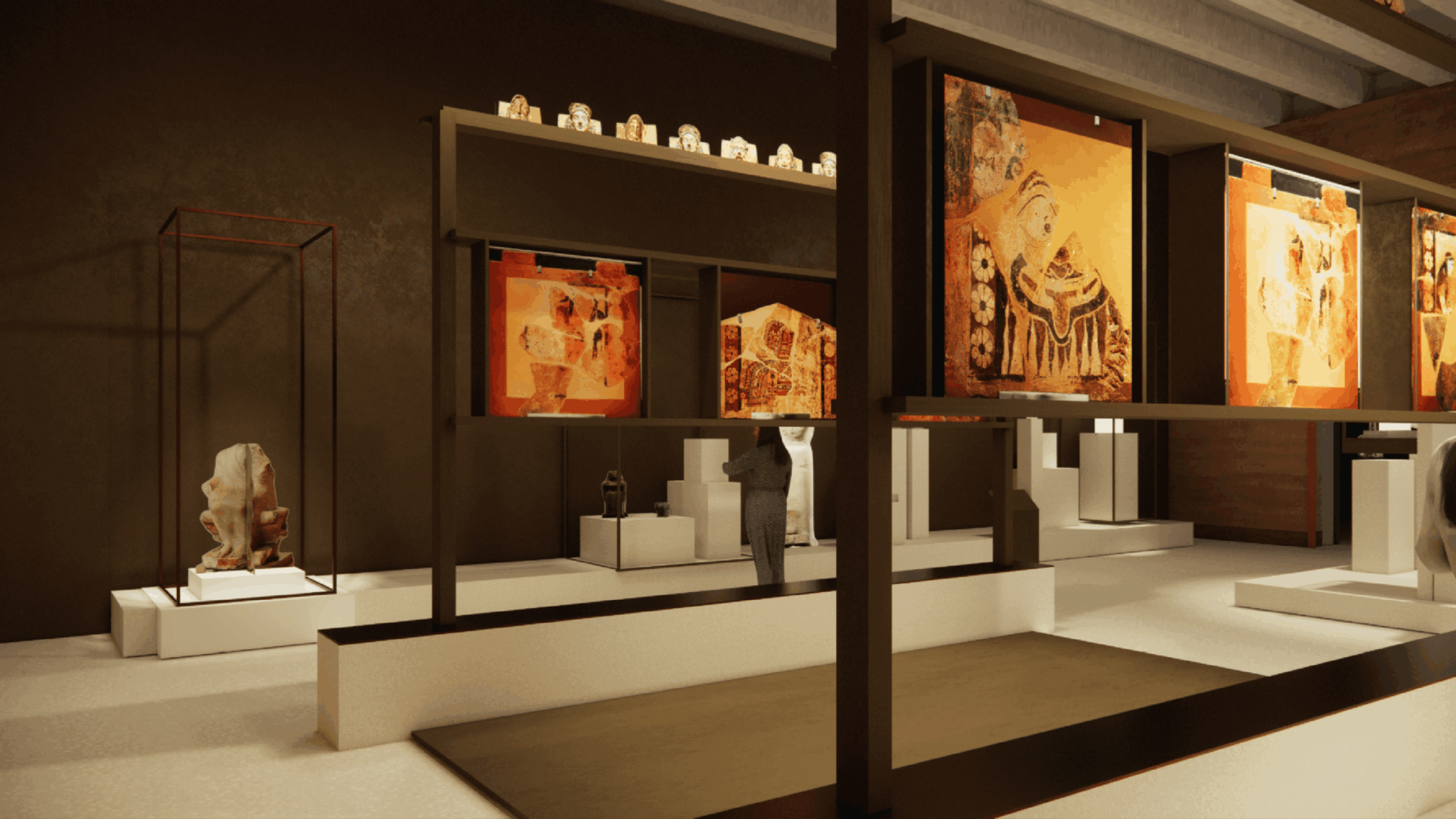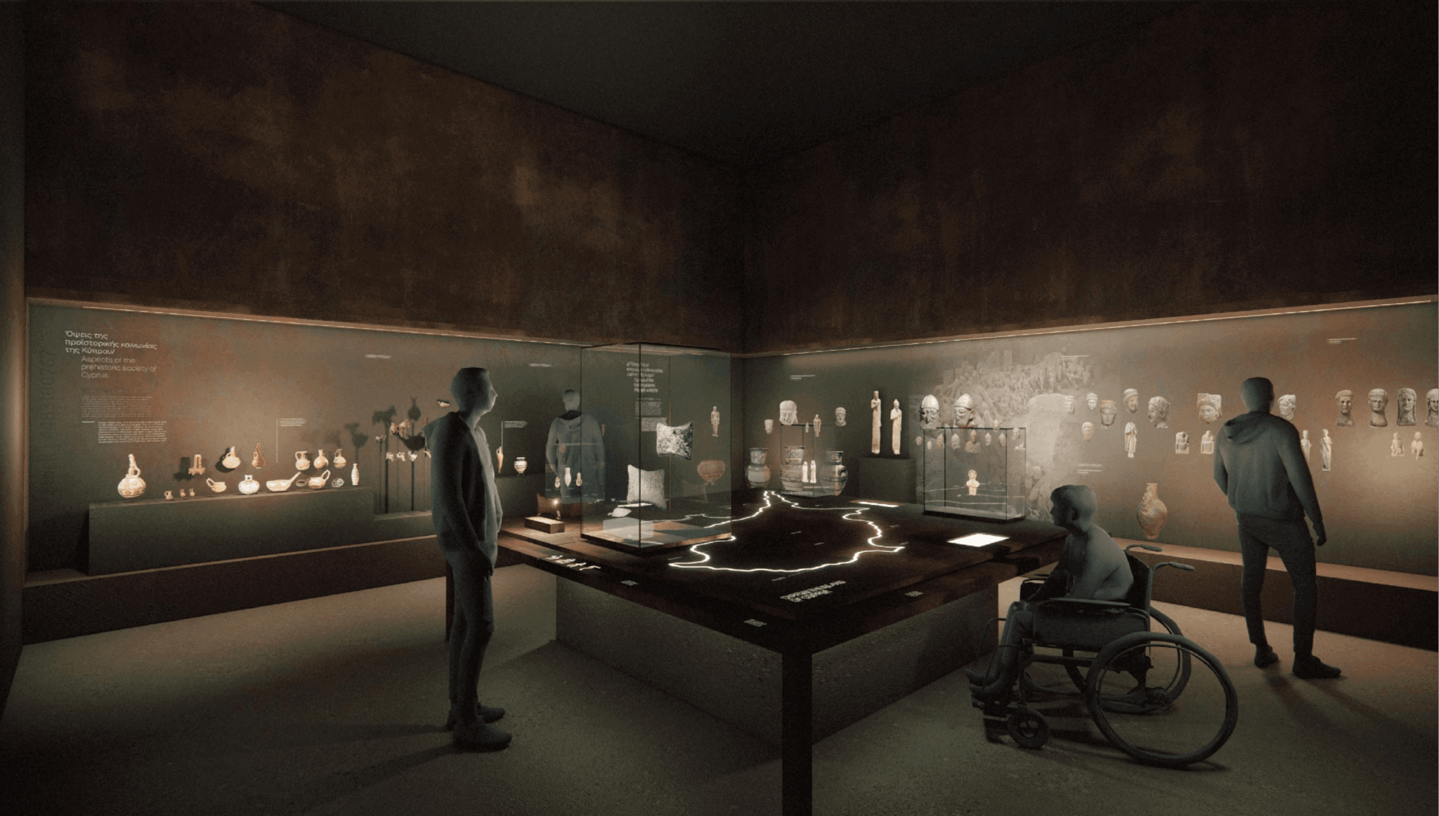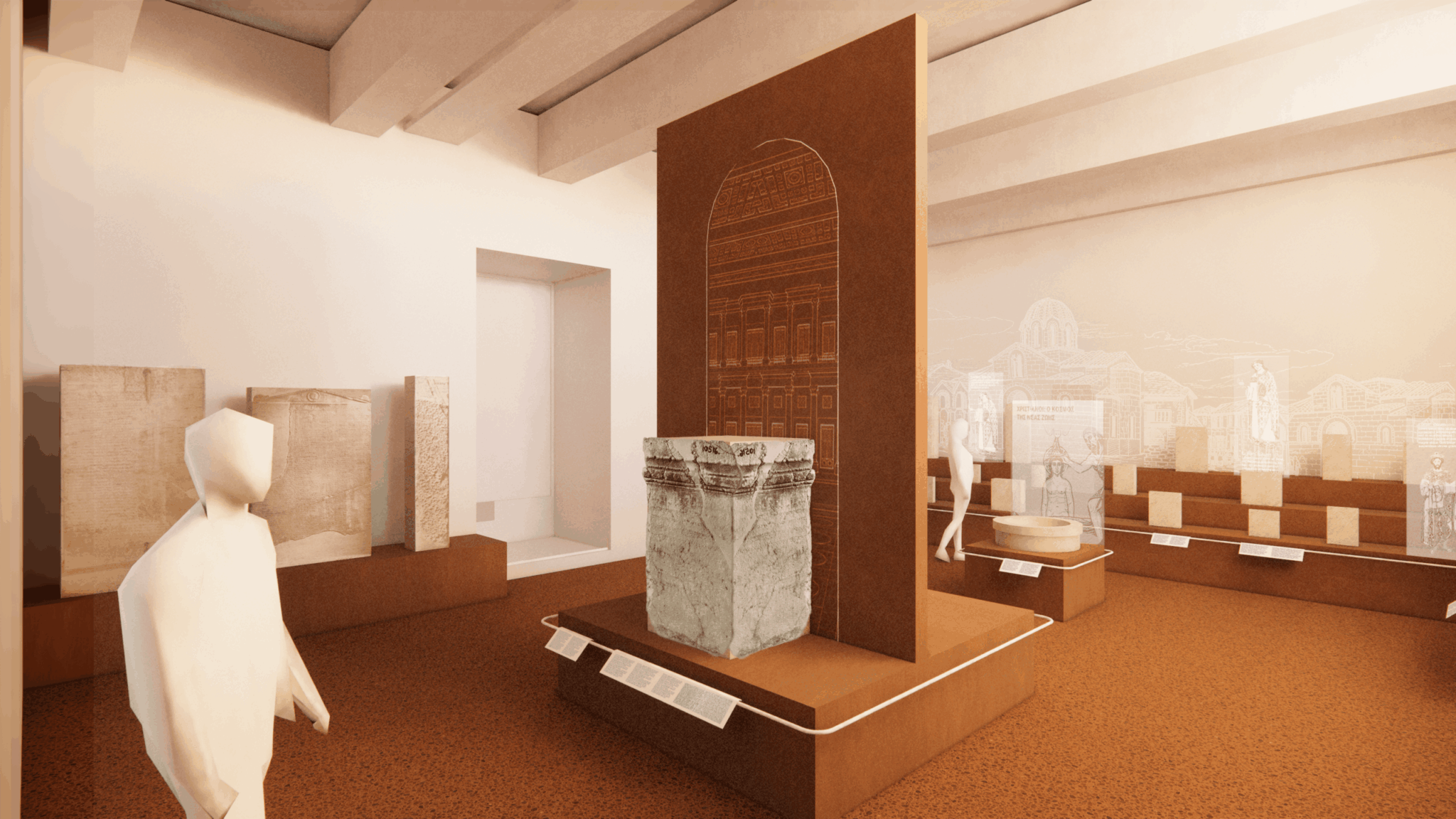– στην οργάνωση των βασικών εκθεσιακών ενοτήτων. Στο ΕΑΜ εστιάζει στην ανάδειξη και χωροθέτηση της εισαγωγής και του επιλόγου της έκθεσης, στην παρουσίαση του «κεντρικού άξονα», ο οποίος δομείται γύρω από εμβληματικά αντικείμενα – εκθέματα, παράλληλα με τον κεντρικό και τους γύρω από αυτόν, άξονες. Για το Επιγραφικό Μουσείο, η παρουσίαση της έκθεσης αναπτύσσεται σε τρία επίπεδα (έκθεση σε νησίδες, ελεύθερα μνημεία, πανόραμα, ανοικτή αποθήκευση και έρευνα).