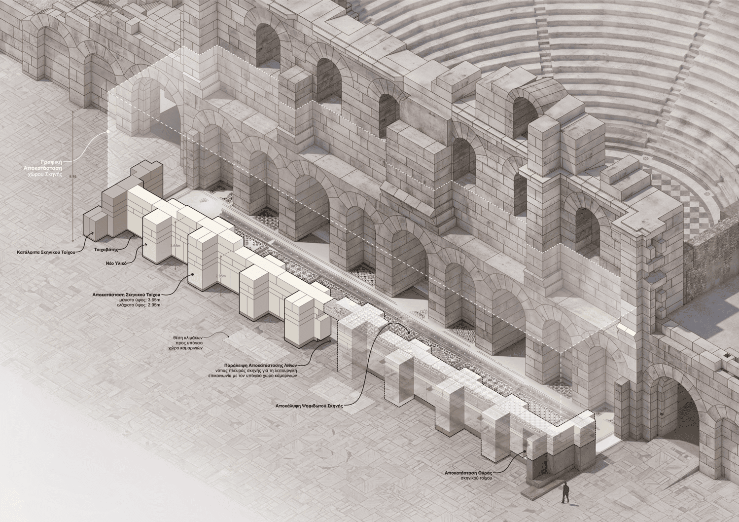 1. Στη Σκηνική Αίθουσα, όπου προβλέπεται η αποκατάσταση του περιγράμματός της σε ύψος ικανό να αναδείξει την τρίτη διάστασή της, αλλά και να εξυπηρετήσει την εγκατάσταση των περιοδικών κατασκευών για τη λειτουργία των παραστάσεων.