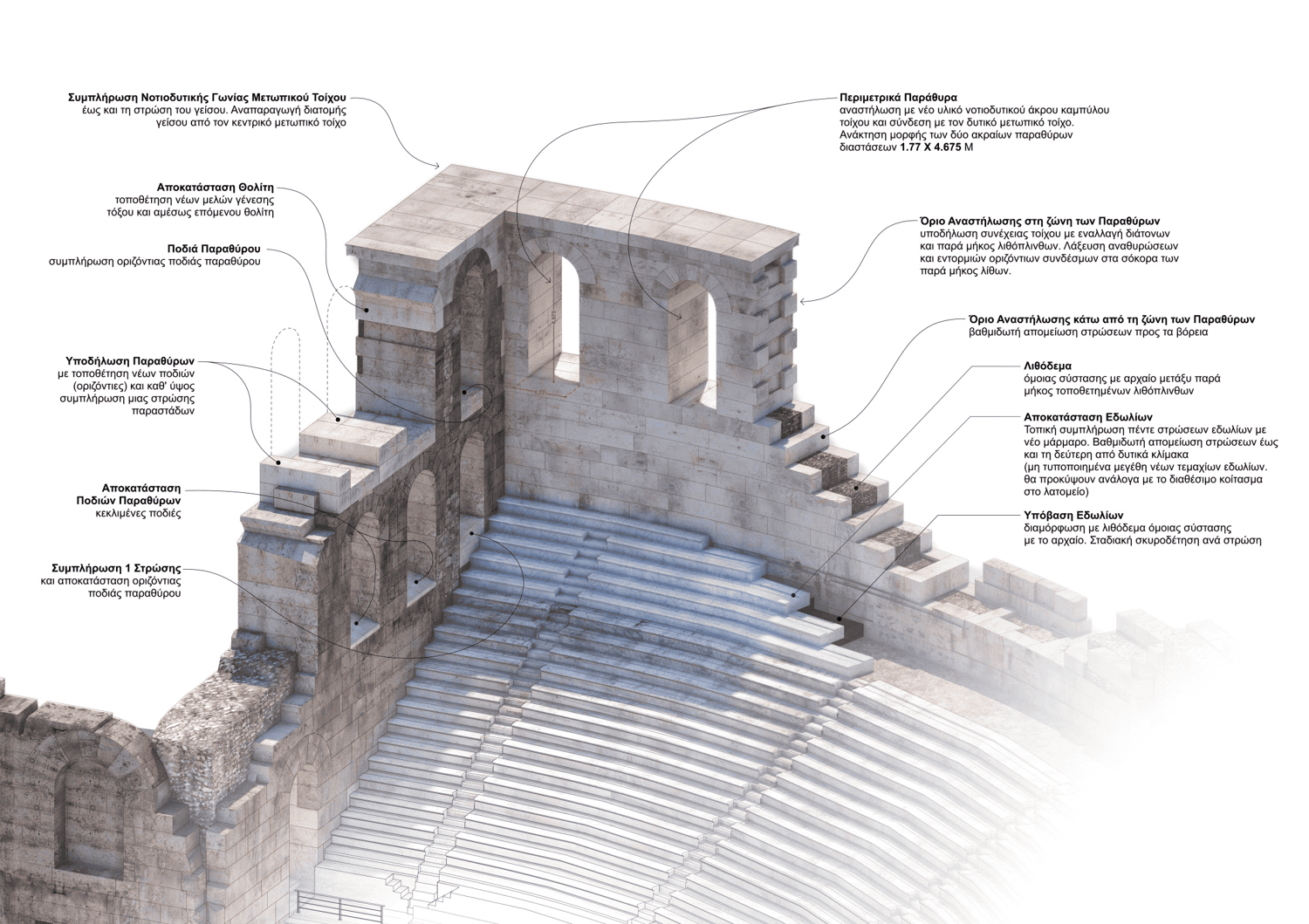 Οι επεμβάσεις δομικής αποκατάστασης περιλαμβάνουν αφαίρεση ασύμβατων νεότερων υλικών, στερεώσεις και συγκολλήσεις λίθων, αντικαταστάσεις φθαρμένων στοιχείων, συμπληρώσεις κενών, διορθώσεις παραμορφώσεων.Προβλέπονται, επίσης, εργασίες αναστήλωσης που περιλαμβάνουν:Ανάκτηση τοίχων και δομικών στοιχείων, αναστήλωση θόλου και κλιμακοστασίου, αποκατάσταση αρχιτεκτονικών μελών, στερέωση και αποκατάσταση του νότιου τοίχου της σκηνής, ανακατασκευή του λογείουκαι του περιμετρικού τοίχου του. Επίσης, θα ελεγχθεί η στατική επάρκεια των αποκατεστημένων τμημάτων των αναστηλώσεων της δεκαετίας του 1950, καθώς και των επισκευών τους. Ιδιαίτερο ενδιαφέρον παρουσιάζει η αποκάλυψη και η ανάδειξη του σκηνικού οικοδομήματος και των ψηφιδωτών δαπέδων του, τα οποία, σήμερα, παραμένουν αθέατα. Παράλληλα, θα μελετηθεί και θα αποτιμηθεί η καταπόνηση του μνημείου από τις ηχητικές επιβαρύνσεις. Για το σύνολο του μνημείου και του περιβάλλοντος χώρου του αντιμετωπίζεταιη απορροή τωνομβρίων, επανασχεδιάζονταιτα ηλεκτρομηχανολογικά δίκτυα, ενώ μελετάται η πυροπροστασία του μνημείου και η αναβάθμιση του συστήματος αποχέτευσης.